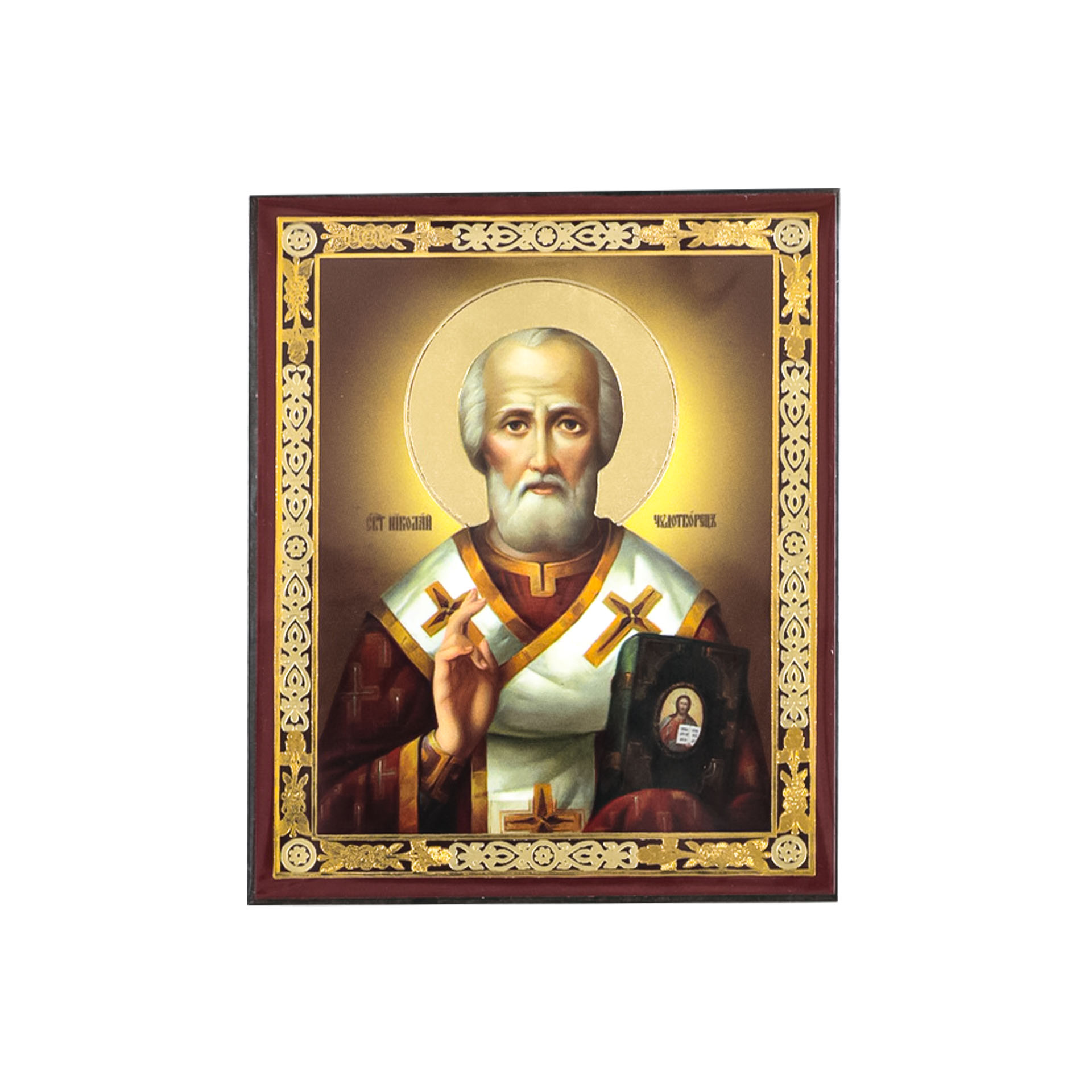 Икона на деревянном планшете 6х9 двойное тиснение, аннотация, упаковка Николай Чудотворец 30