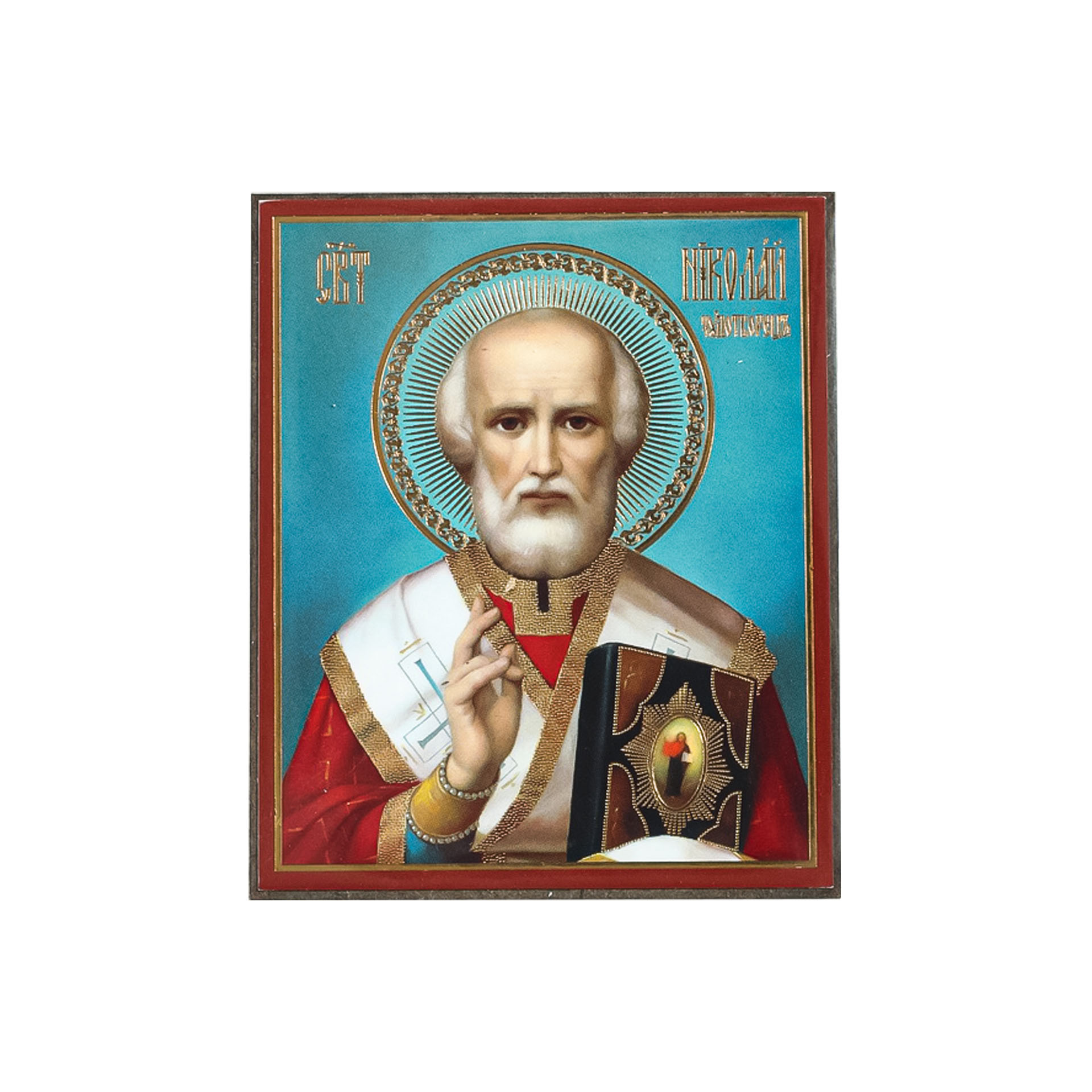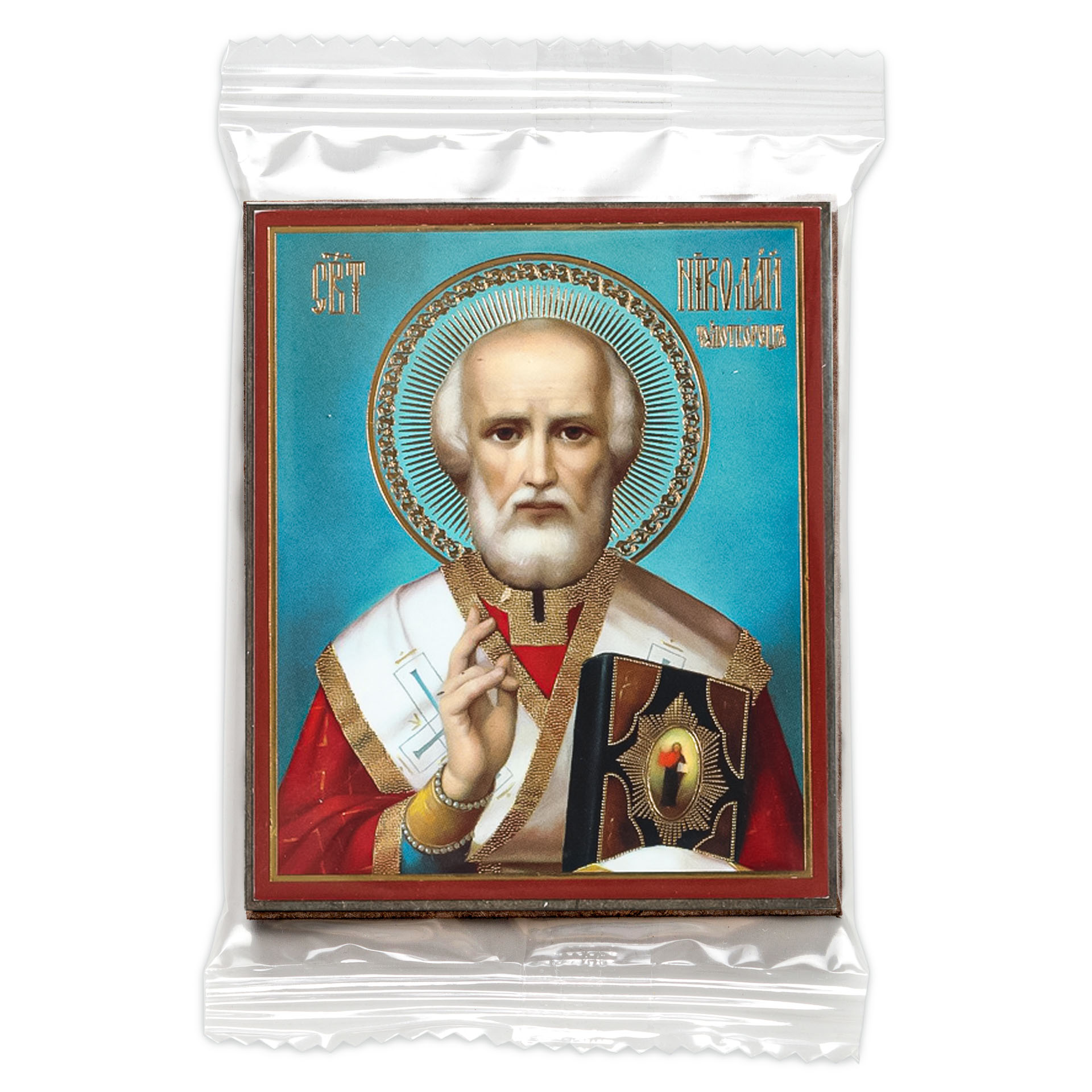Икона на деревянном планшете 6х9 двойное тиснение, аннотация, упаковка Николай Чудотворец 34