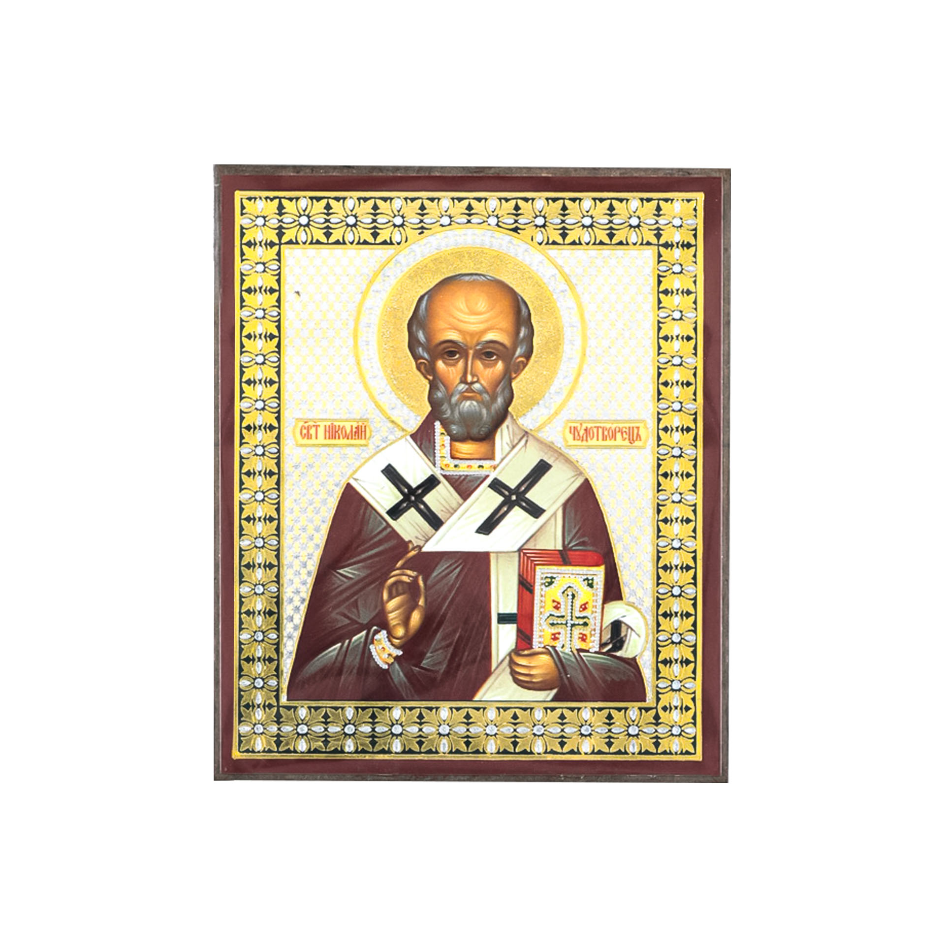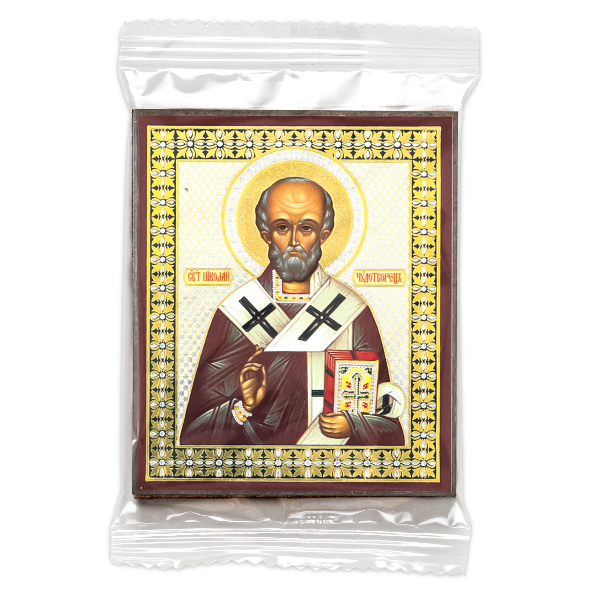 Икона на деревянном планшете 6х9 двойное тиснение, аннотация, упаковка Николай Чудотворец 8
