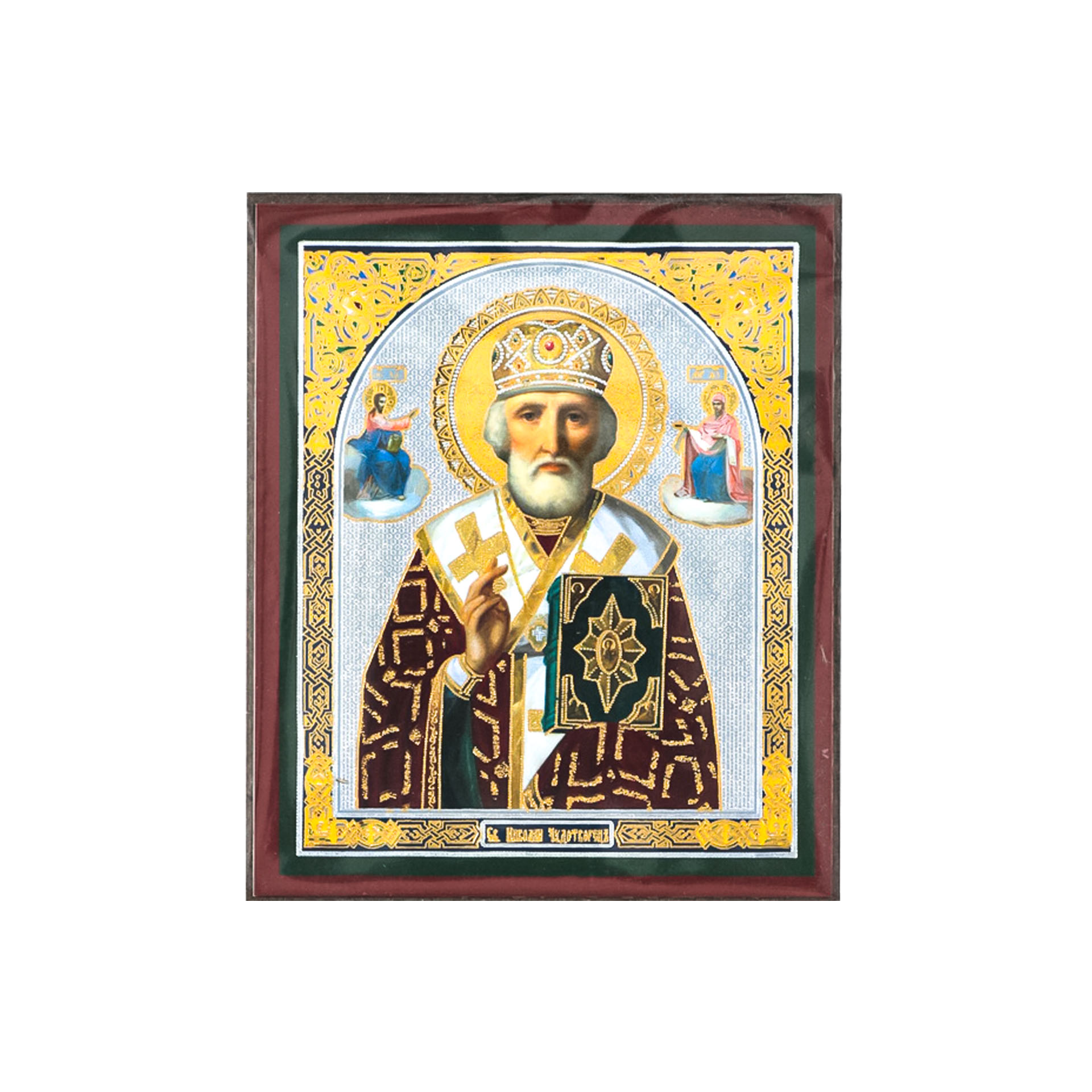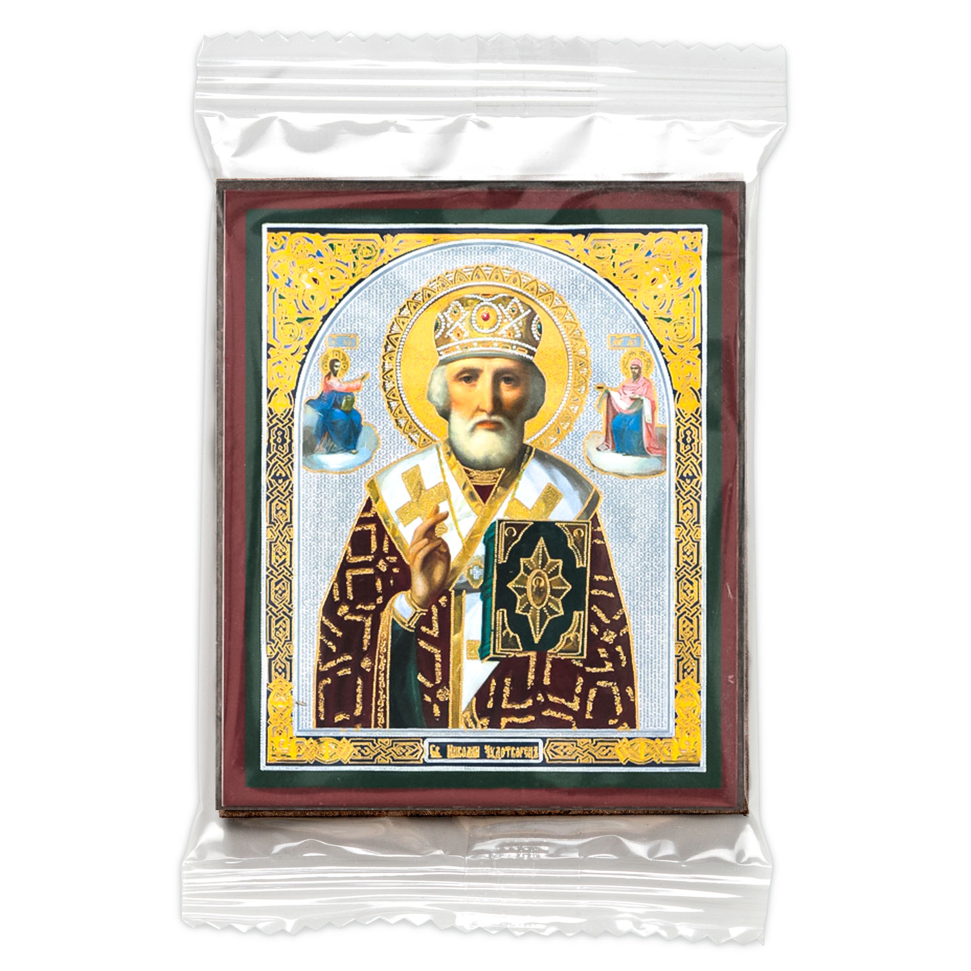 Икона на деревянном планшете 6х9 двойное тиснение, аннотация, упаковка Николай Чудотворец с предстоящими