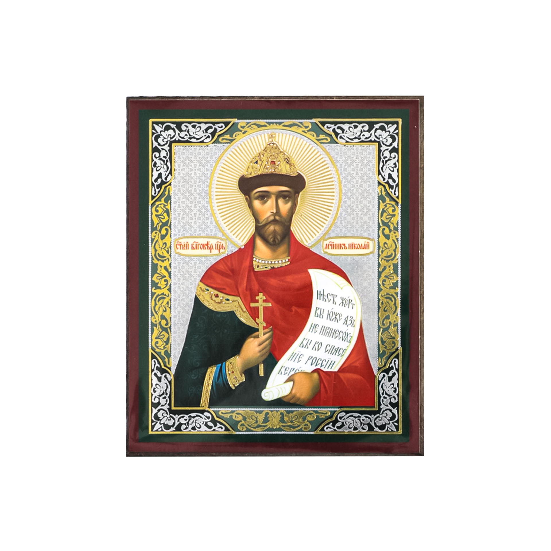 Икона на деревянном планшете 6х9 двойное тиснение, аннотация, упаковка Николай II