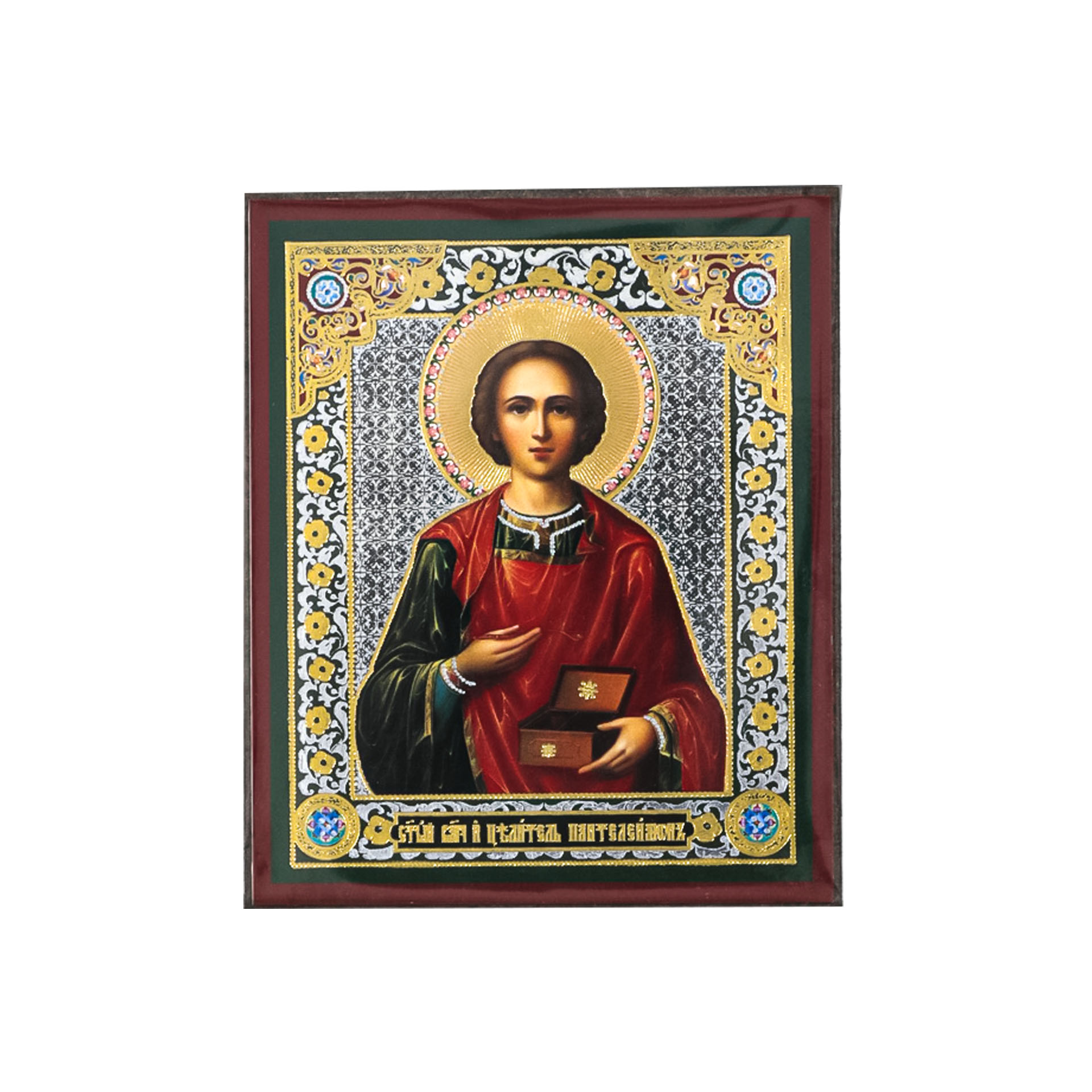 Икона на деревянном планшете 6х9 двойное тиснение, аннотация, упаковка Пантелеимон