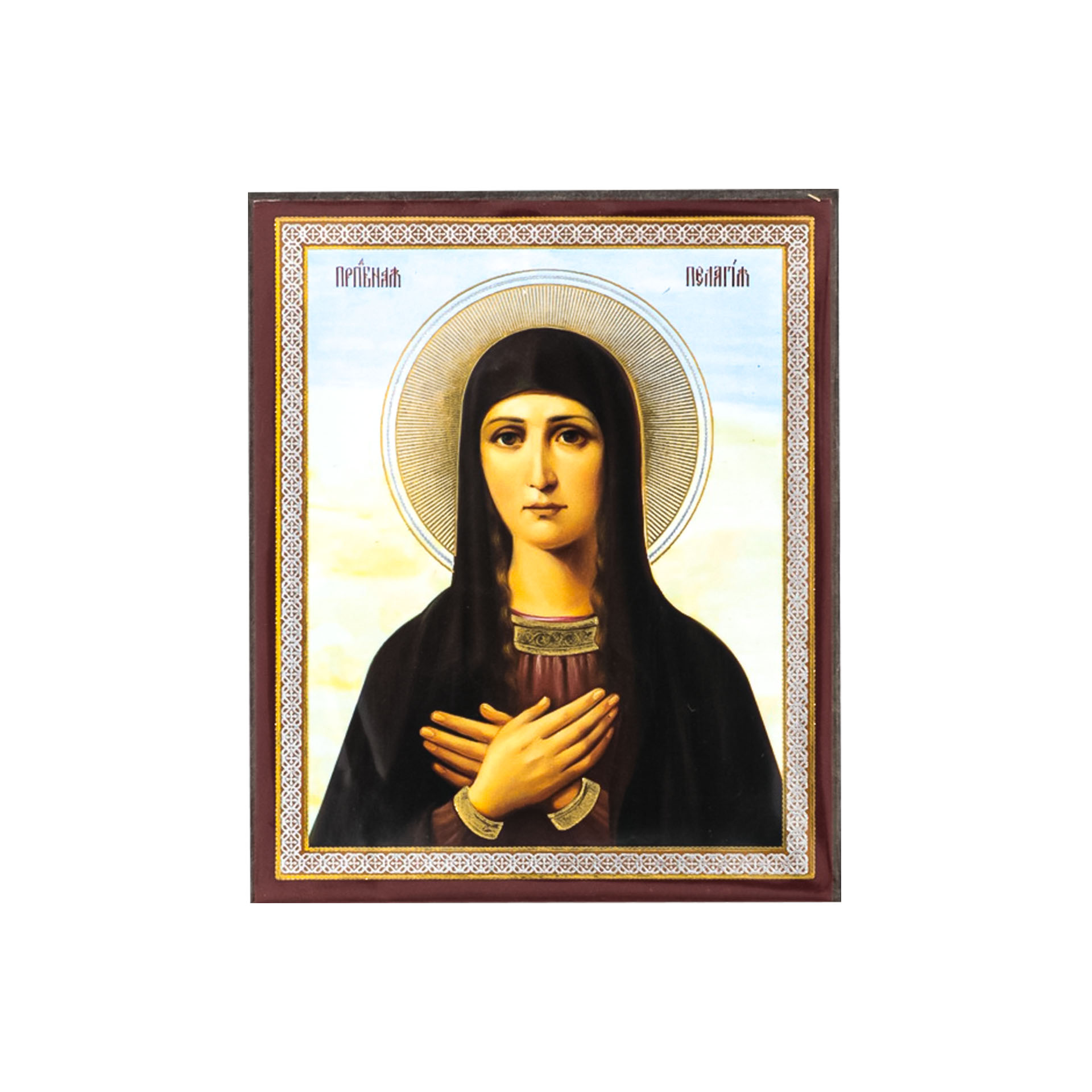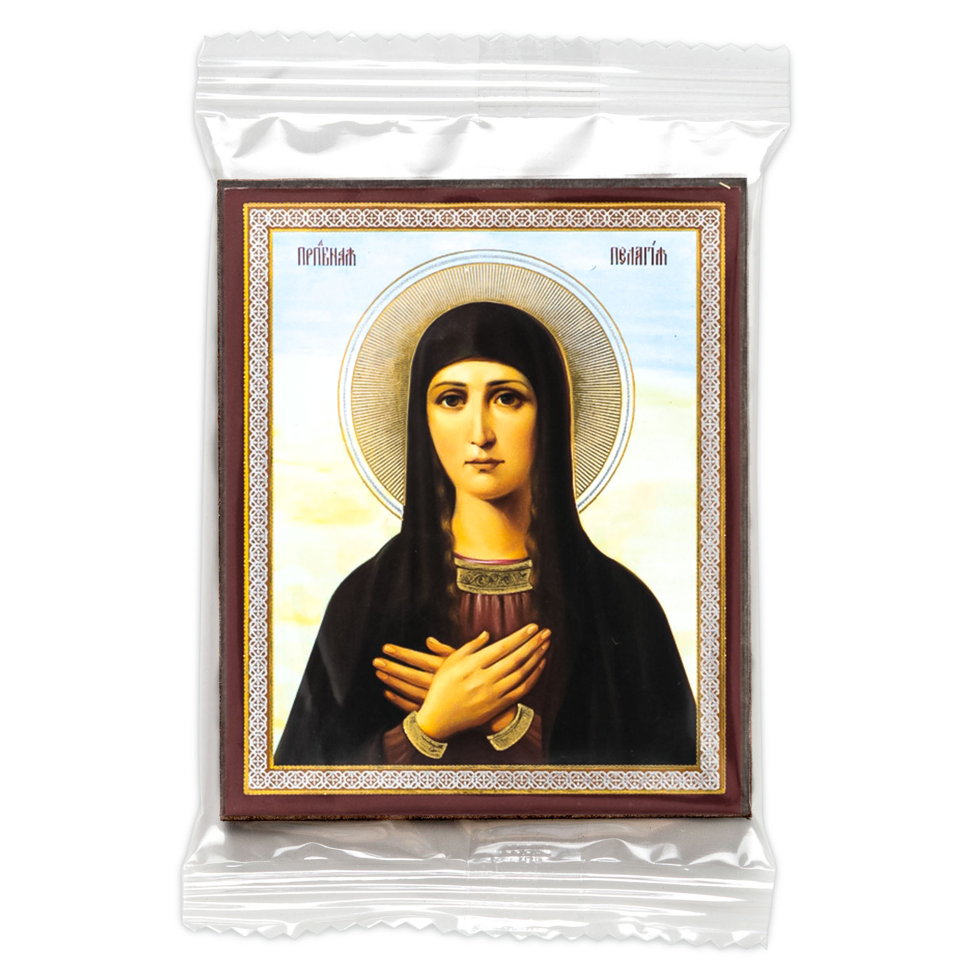 Икона на деревянном планшете 6х9 двойное тиснение, аннотация, упаковка Пелагия 4