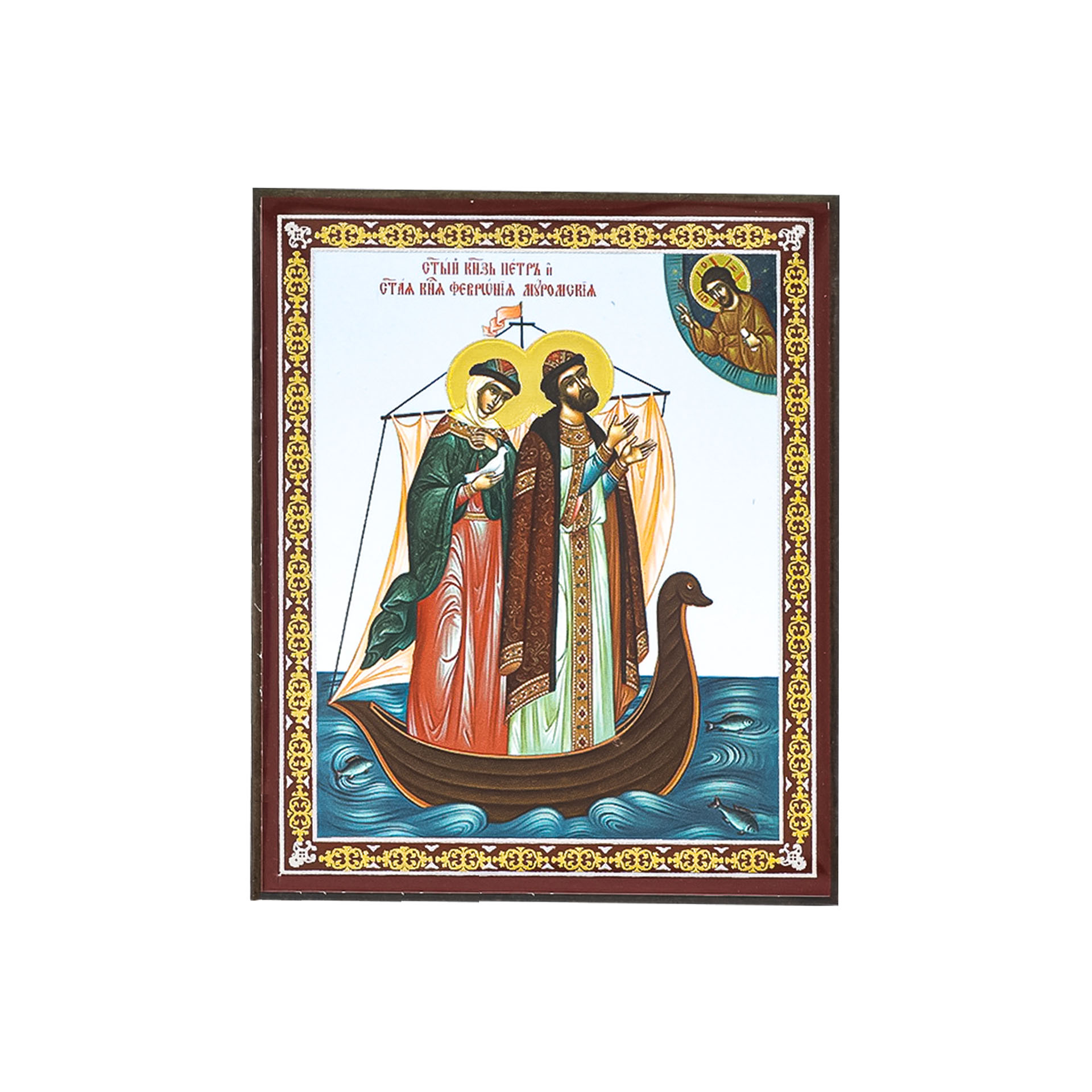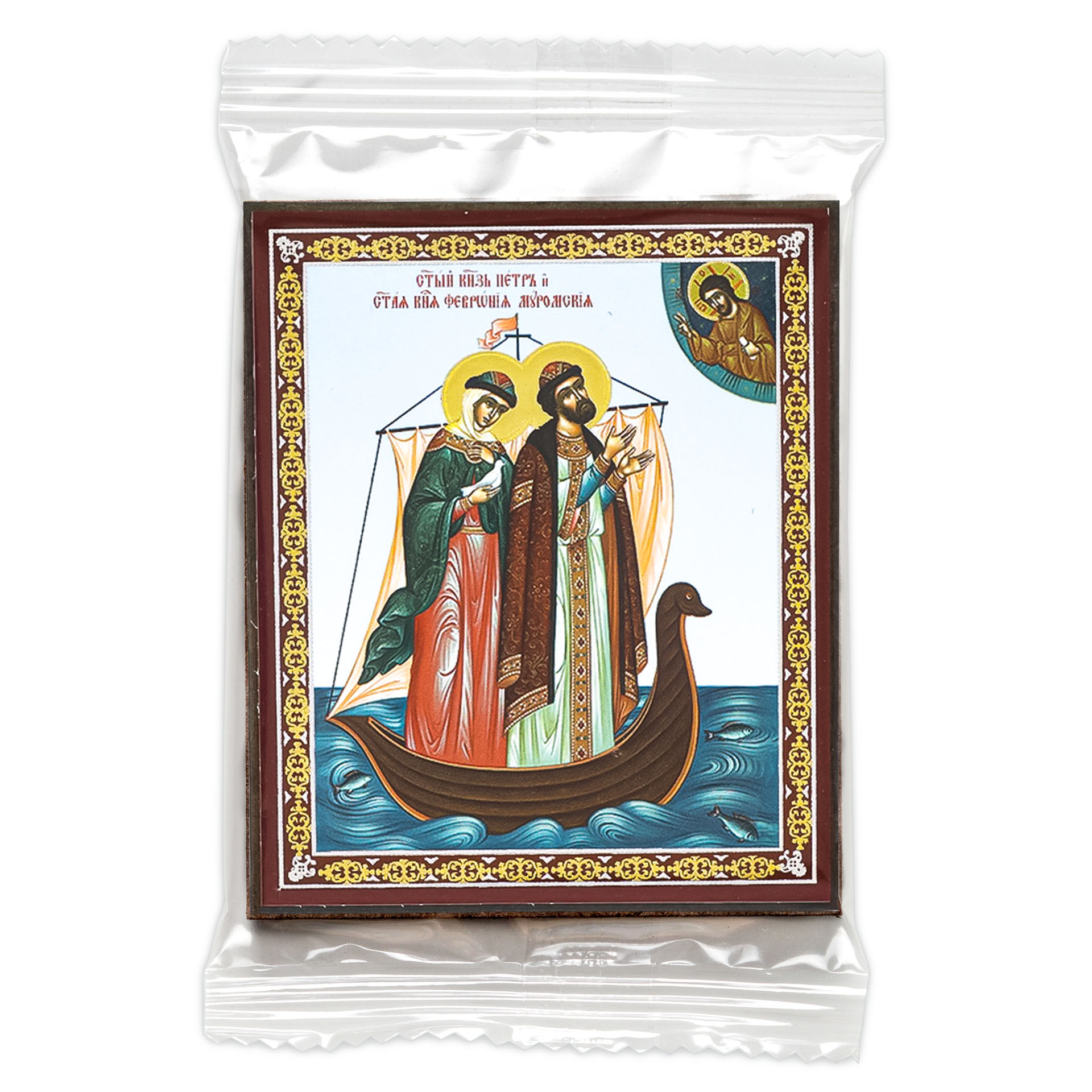 Икона на деревянном планшете 6х9 двойное тиснение, аннотация, упаковка Петр и Феврония 9