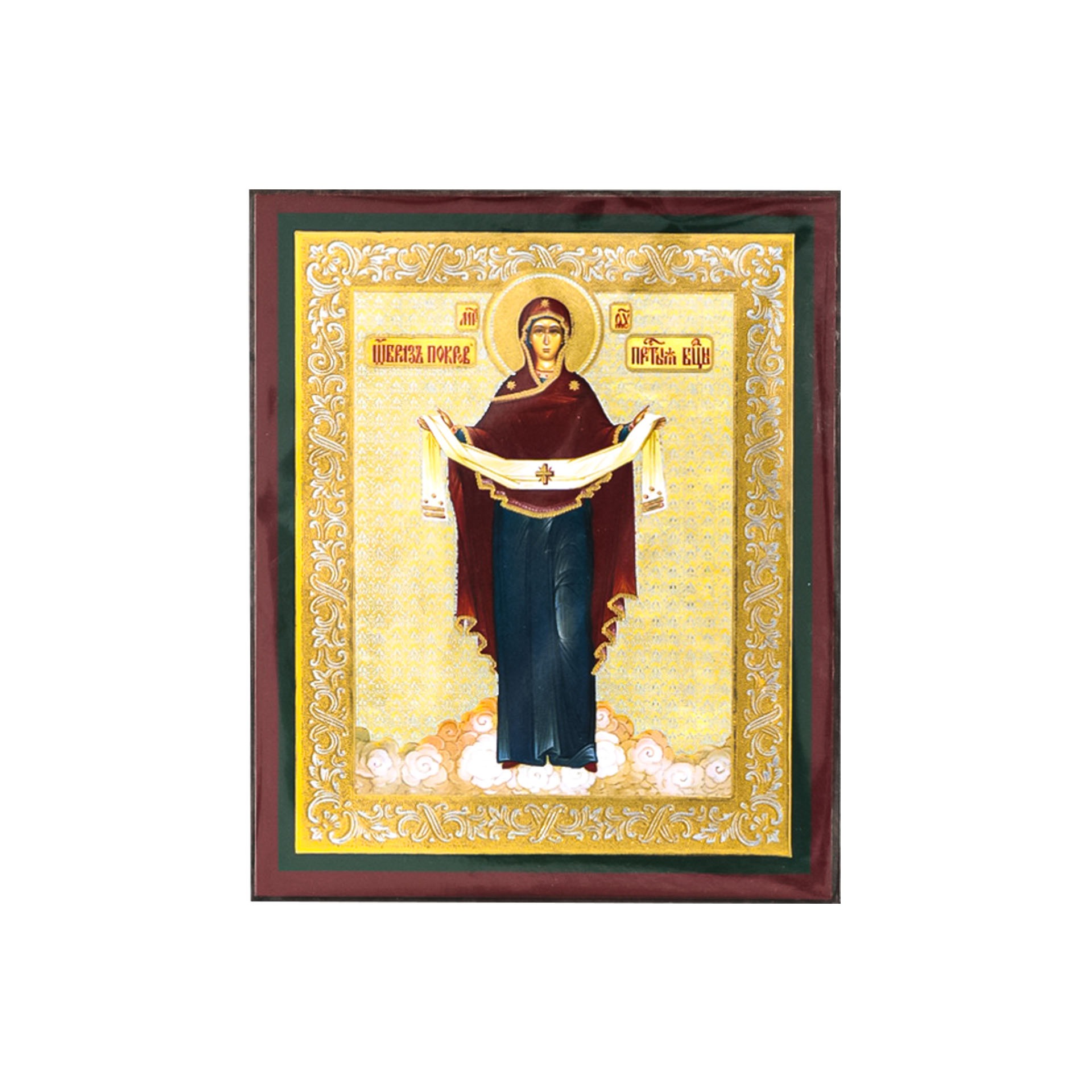 Икона на деревянном планшете 6х9 двойное тиснение, аннотация, упаковка Покров (ростовой)