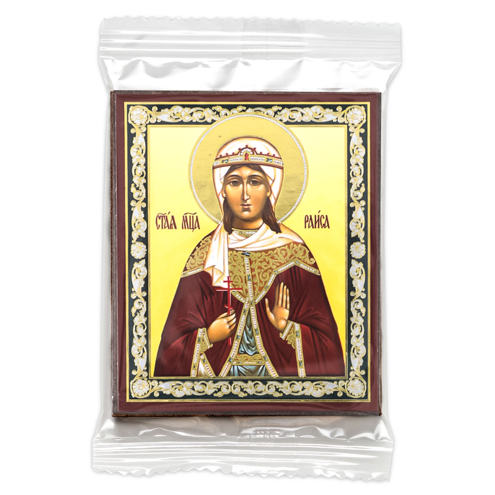 Икона на деревянном планшете 6х9 двойное тиснение, аннотация, упаковка Раиса 2