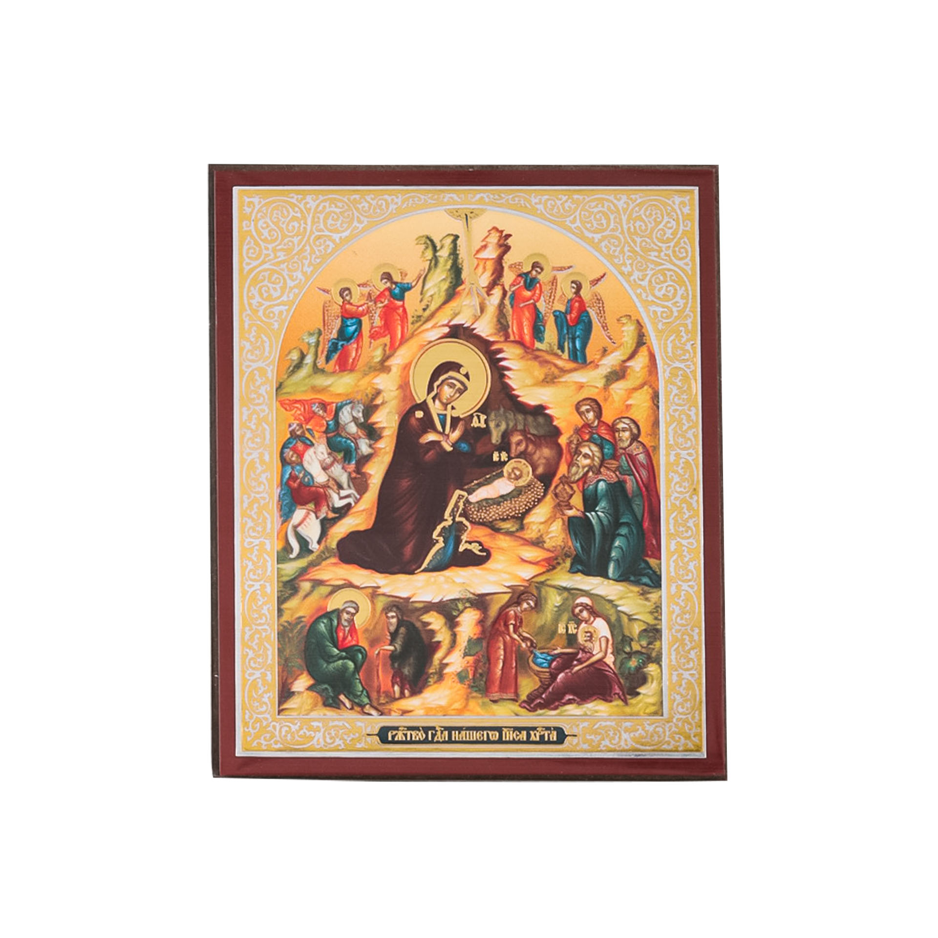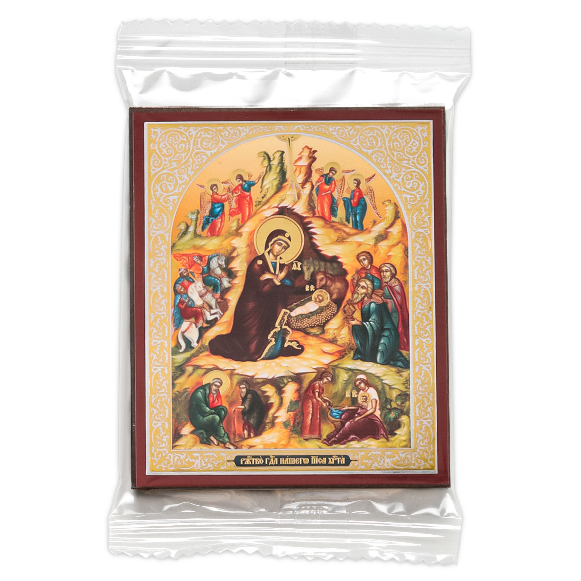 Икона на деревянном планшете 6х9 двойное тиснение, аннотация, упаковка Рождество Христово 40