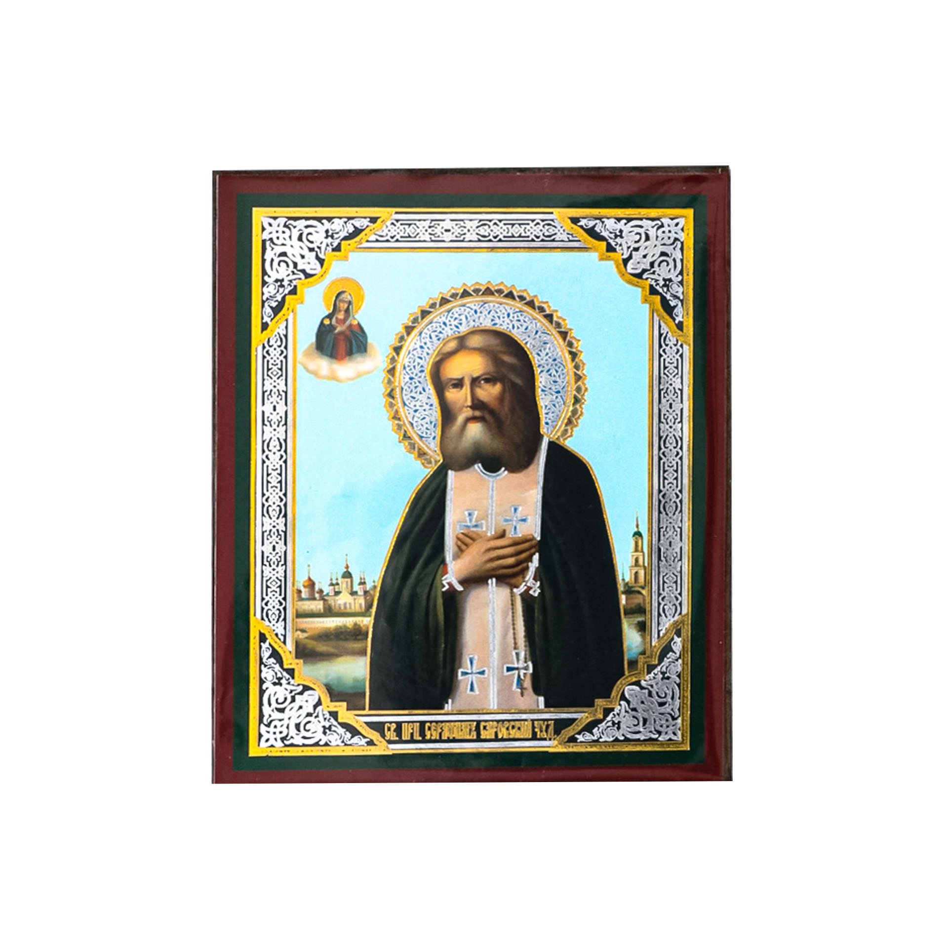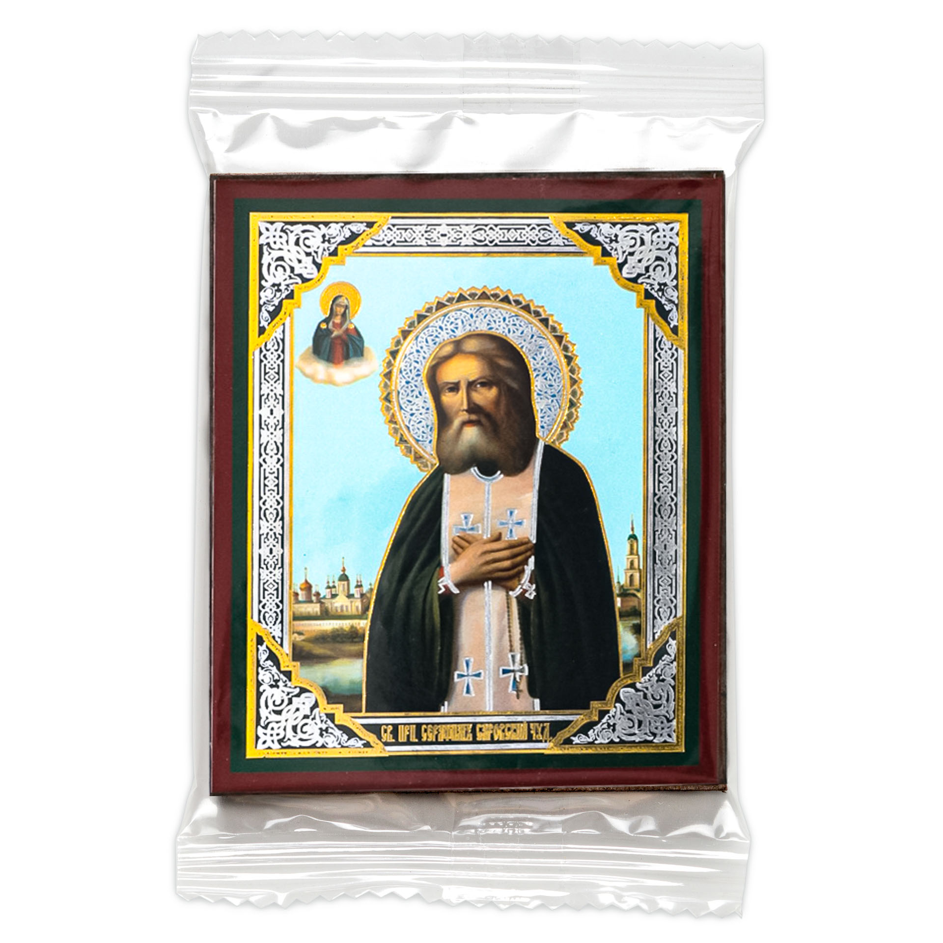Икона на деревянном планшете 6х9 двойное тиснение, аннотация, упаковка Серафим Саровский 2
