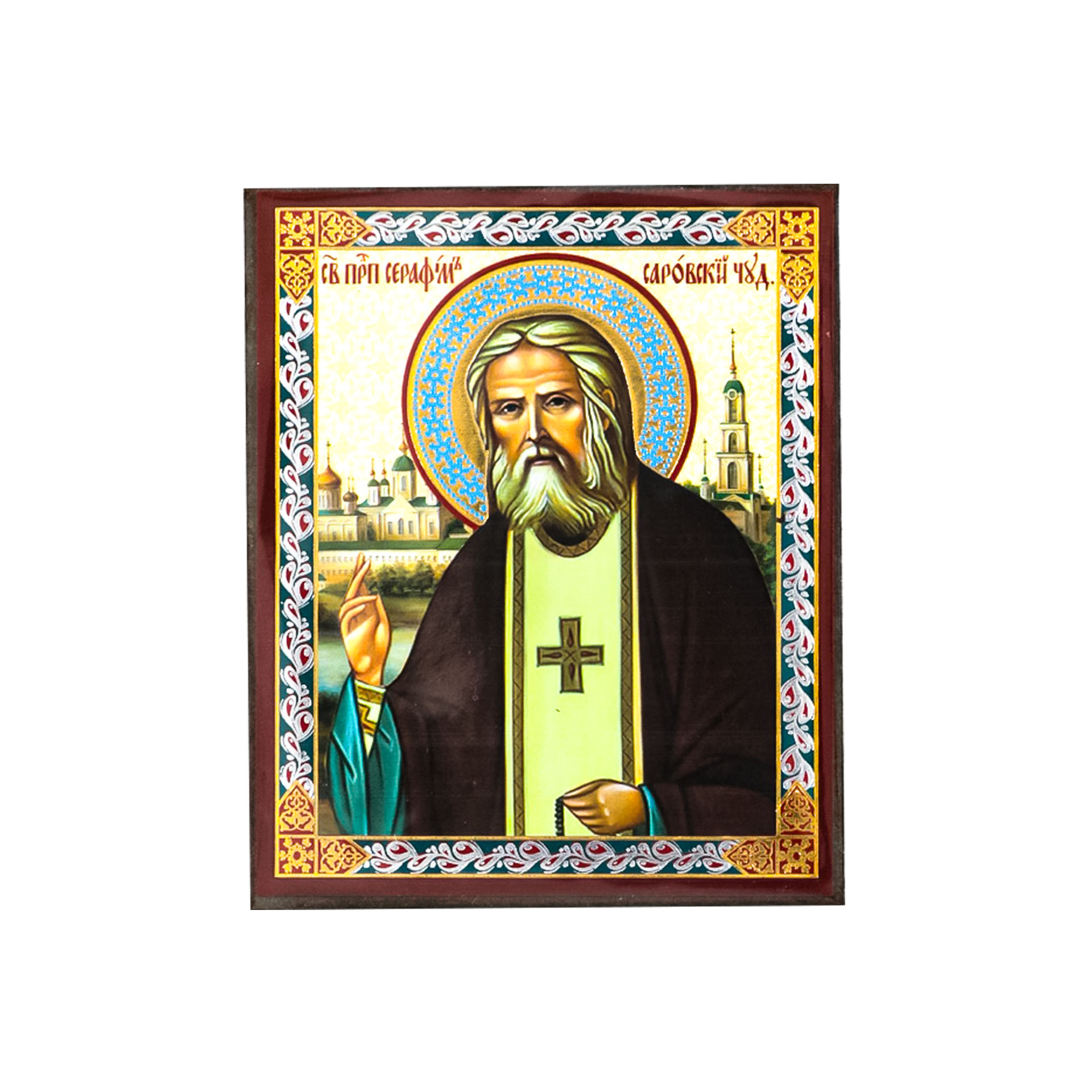 Икона на деревянном планшете 6х9 двойное тиснение, аннотация, упаковка Серафим Саровский 6