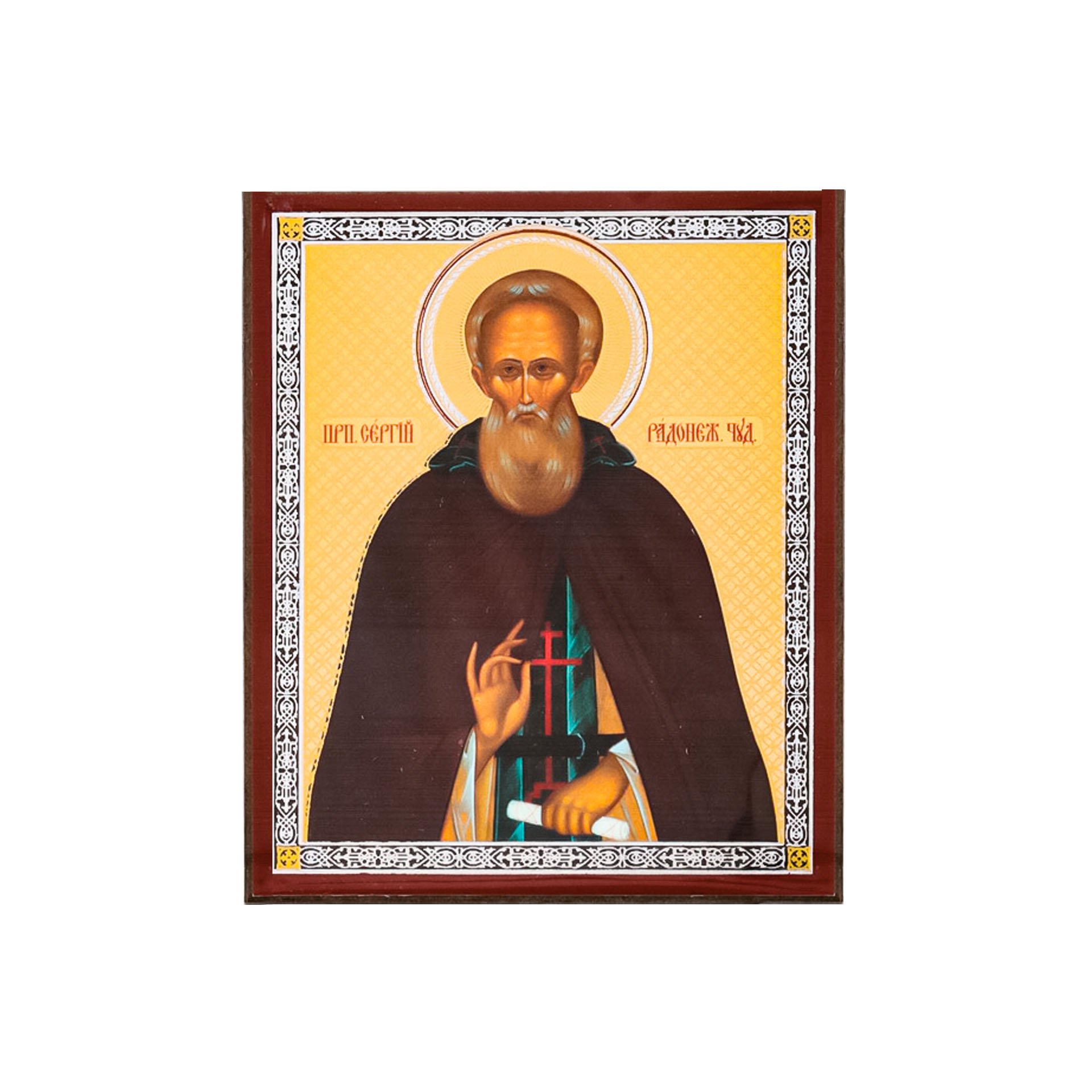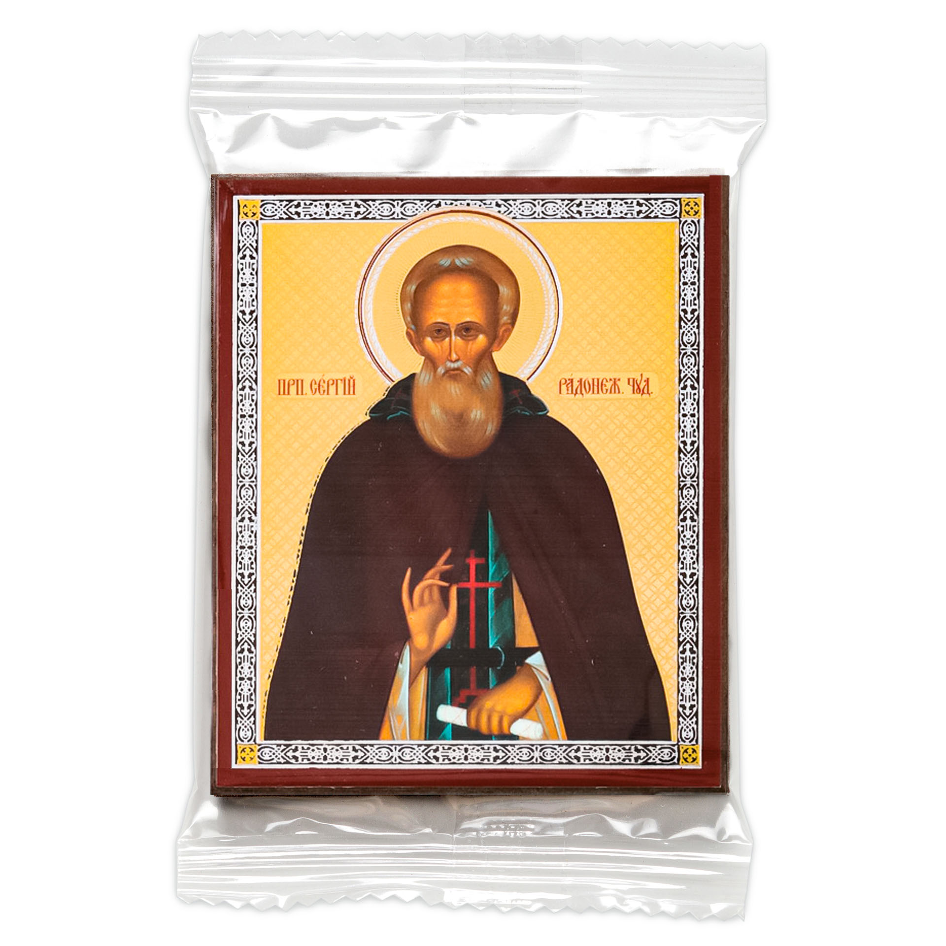 Икона на деревянном планшете 6х9 двойное тиснение, аннотация, упаковка Сергий Радонежский