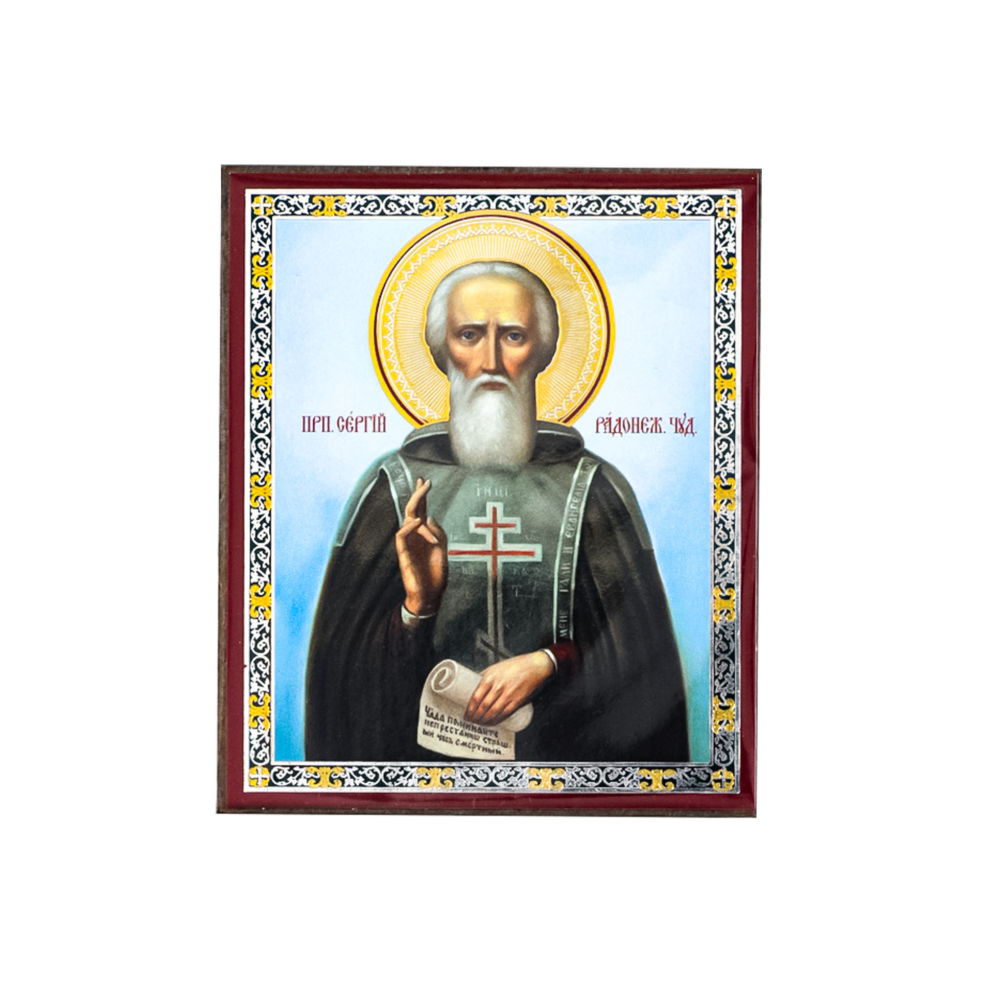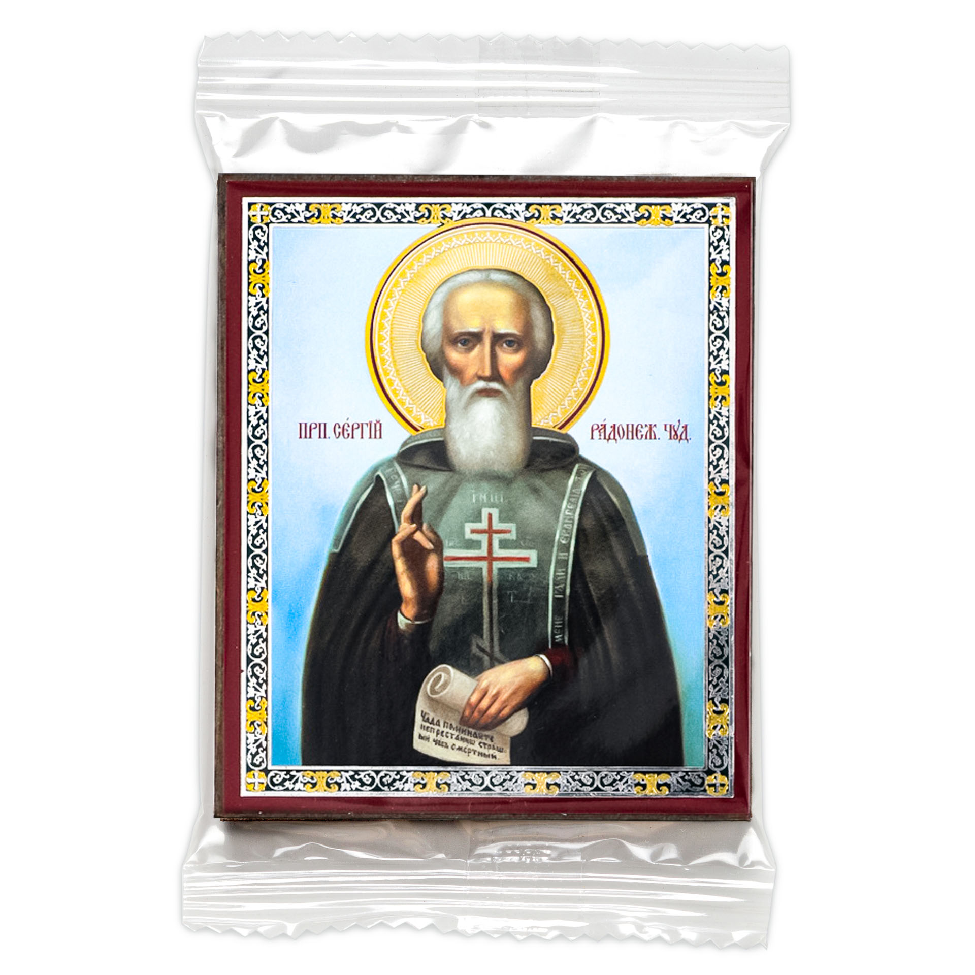 Икона на деревянном планшете 6х9 двойное тиснение, аннотация, упаковка Сергий Радонежский 3