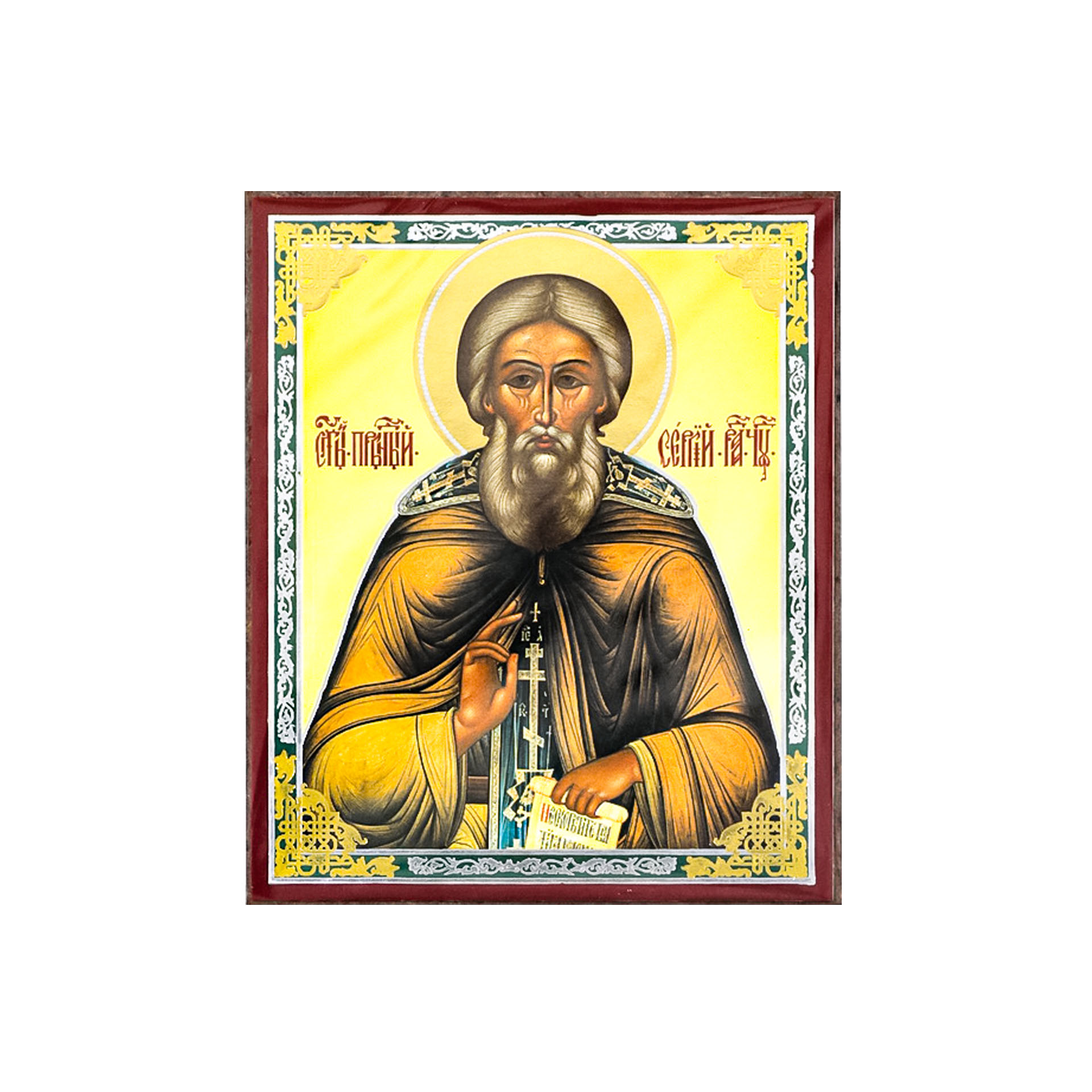 Икона на деревянном планшете 6х9 двойное тиснение, аннотация, упаковка Сергий Радонежский 4