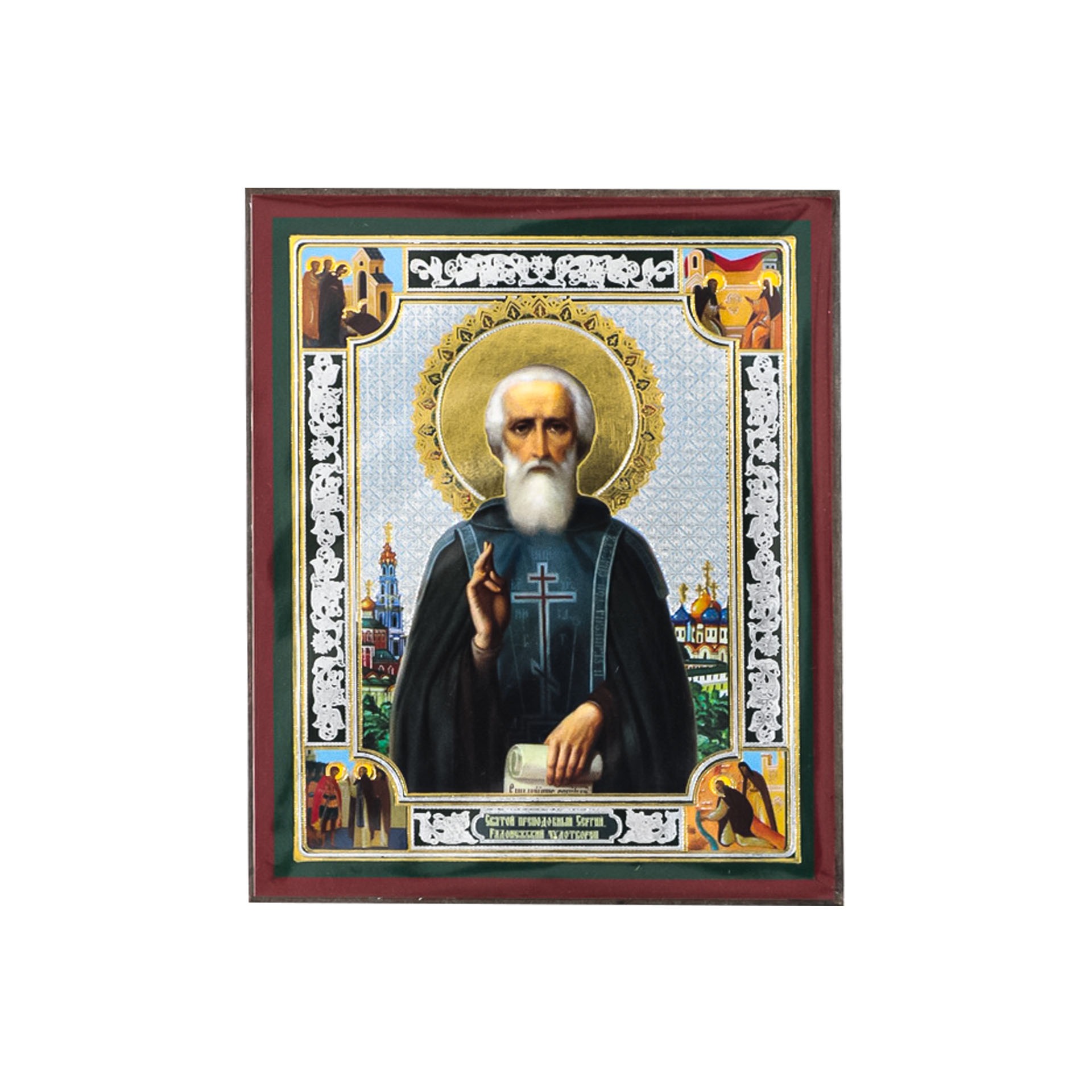 Икона на деревянном планшете 6х9 двойное тиснение, аннотация, упаковка Сергий Радонежский (с клеймами)