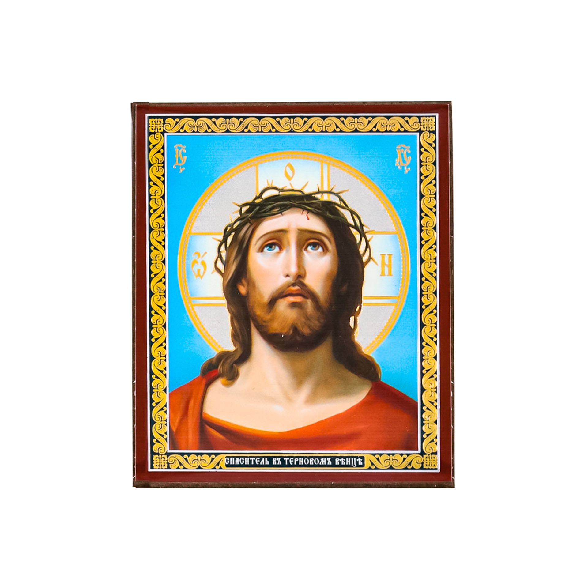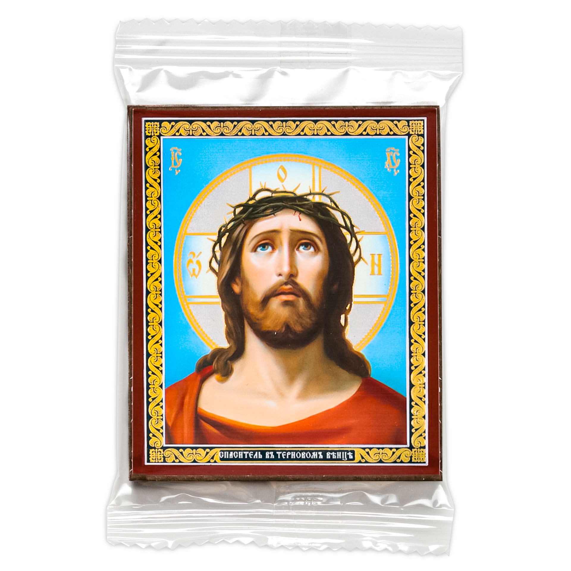Икона на деревянном планшете 6х9 двойное тиснение, аннотация, упаковка Спас в терновом венце №3