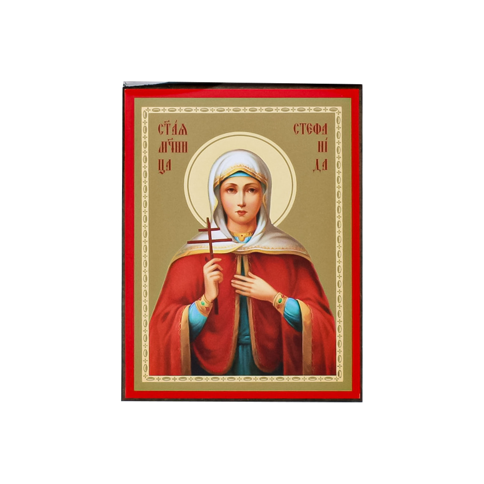 Икона на деревянном планшете 6х9 двойное тиснение, аннотация, упаковка Стефанида