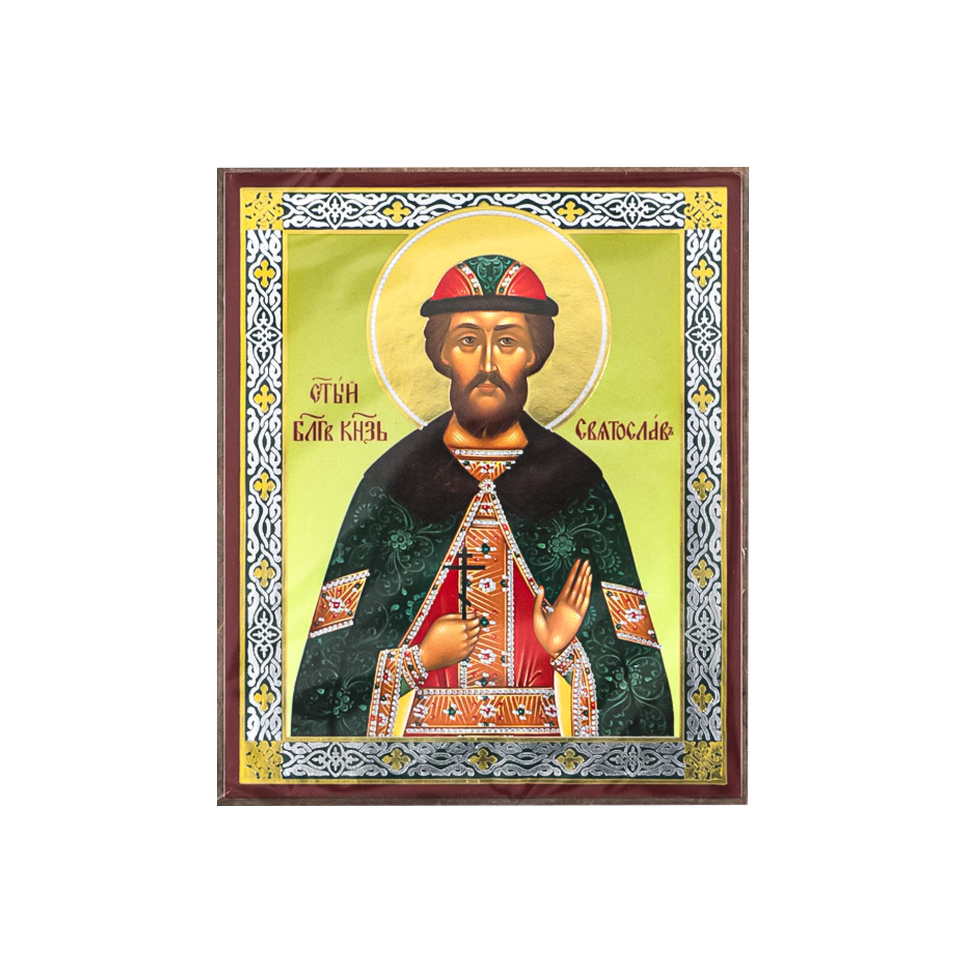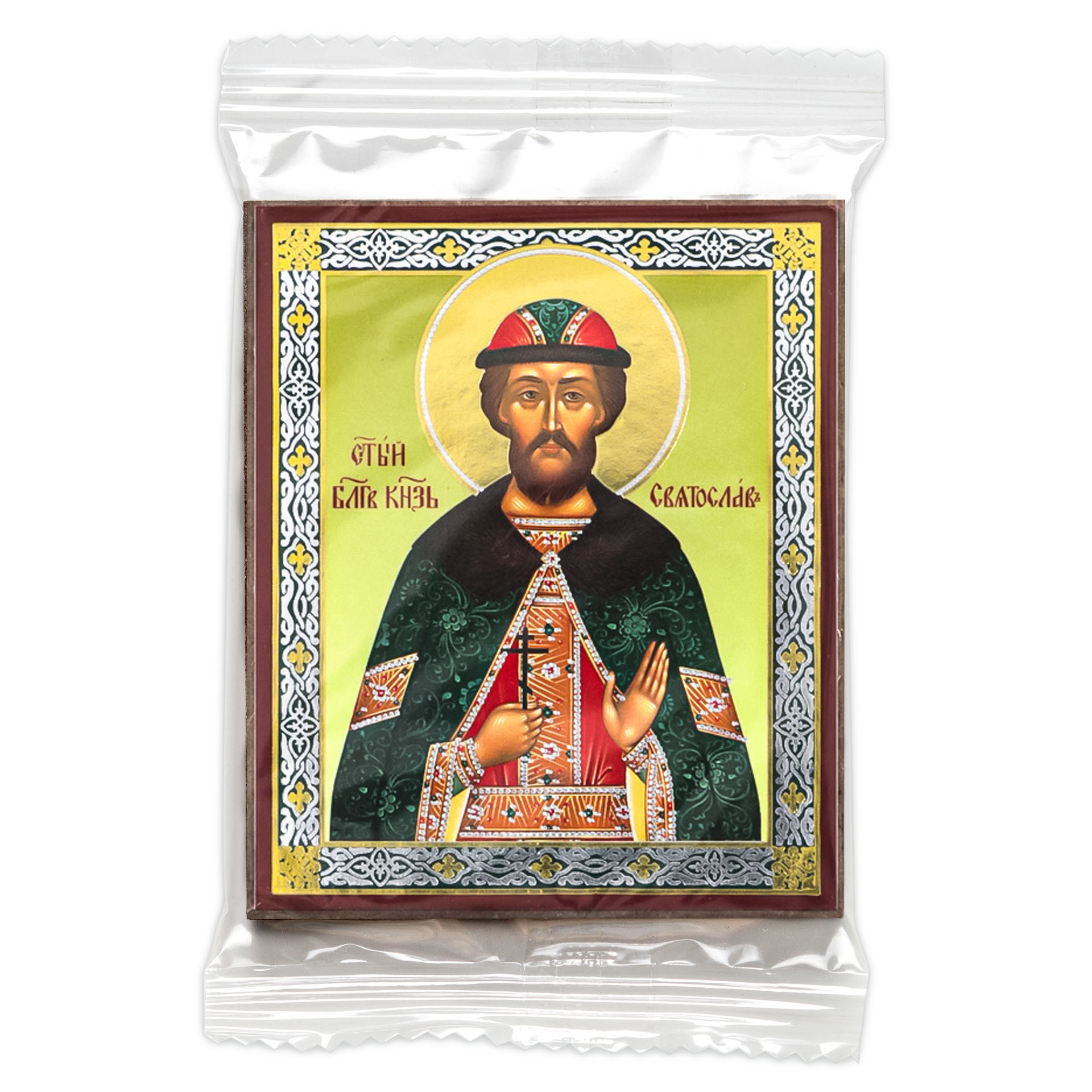 Икона на деревянном планшете 6х9 двойное тиснение, аннотация, упаковка Святослав