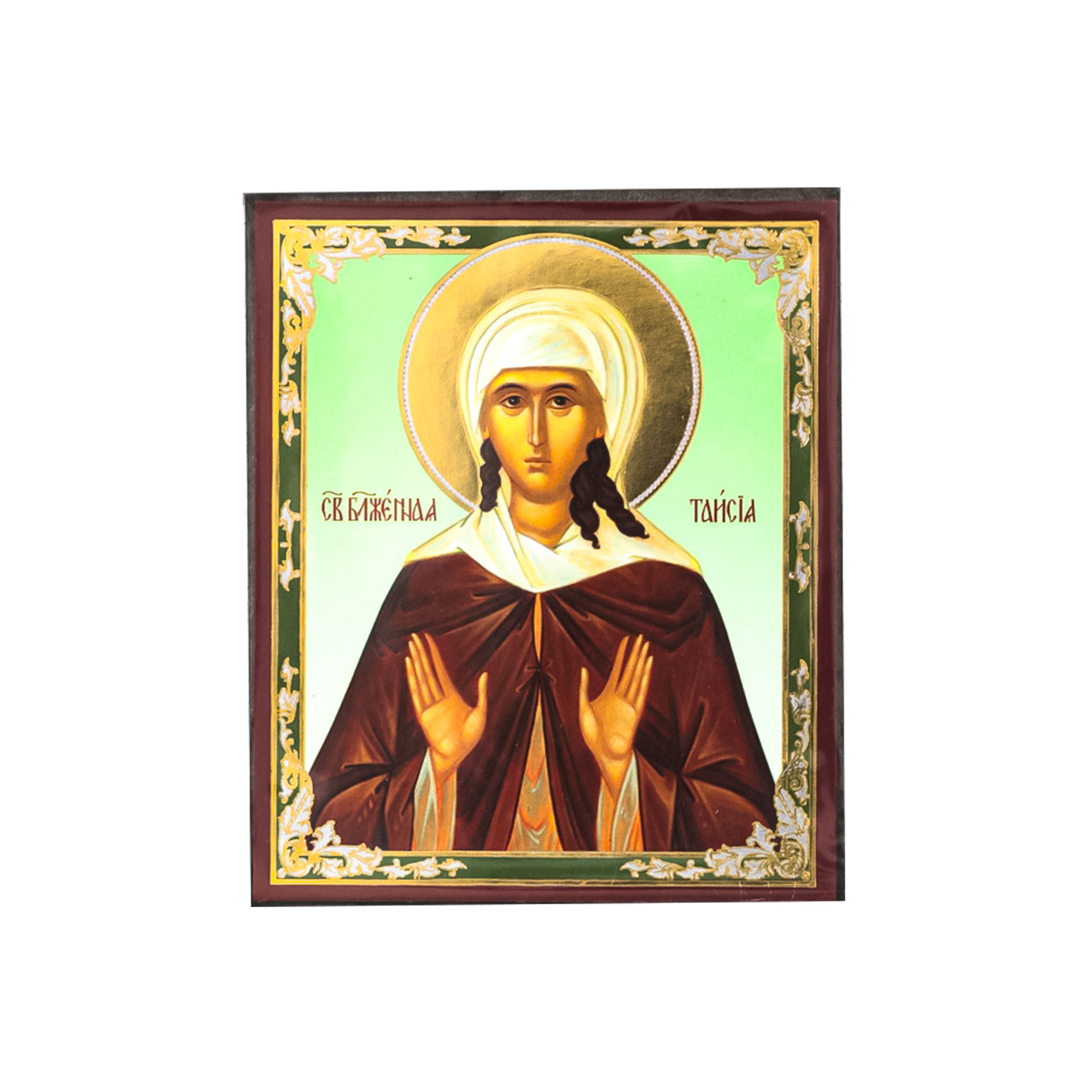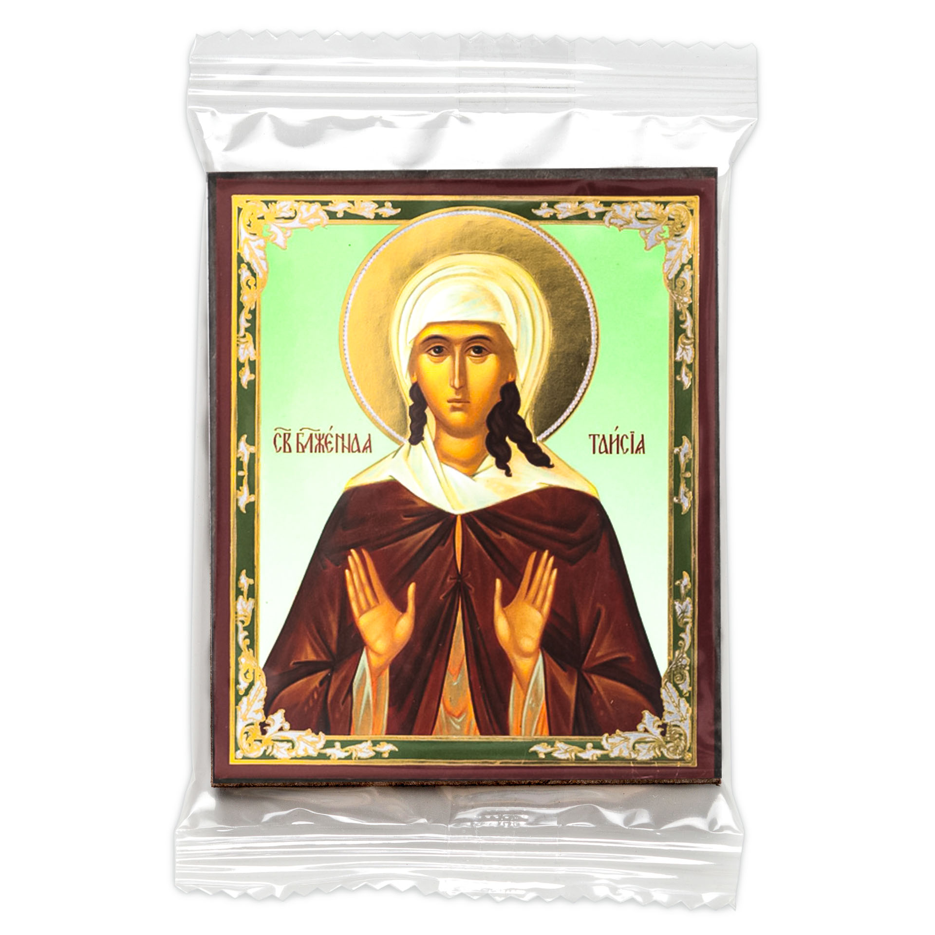 Икона на деревянном планшете 6х9 двойное тиснение, аннотация, упаковка Таисия 2