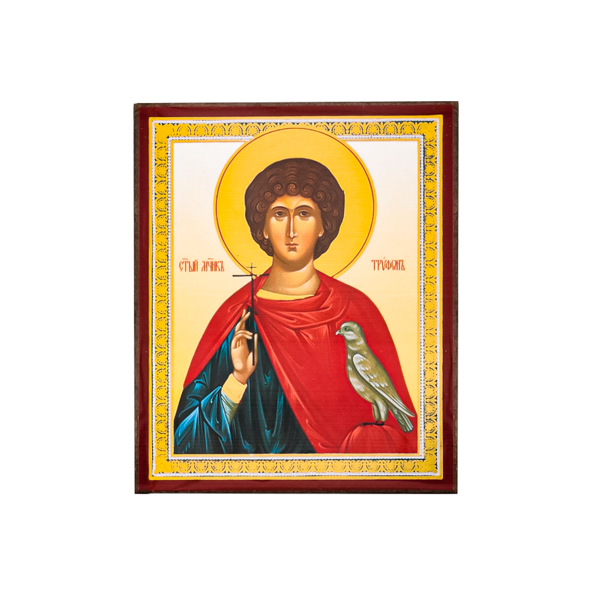 Икона на деревянном планшете 6х9 двойное тиснение, аннотация, упаковка Трифон 2
