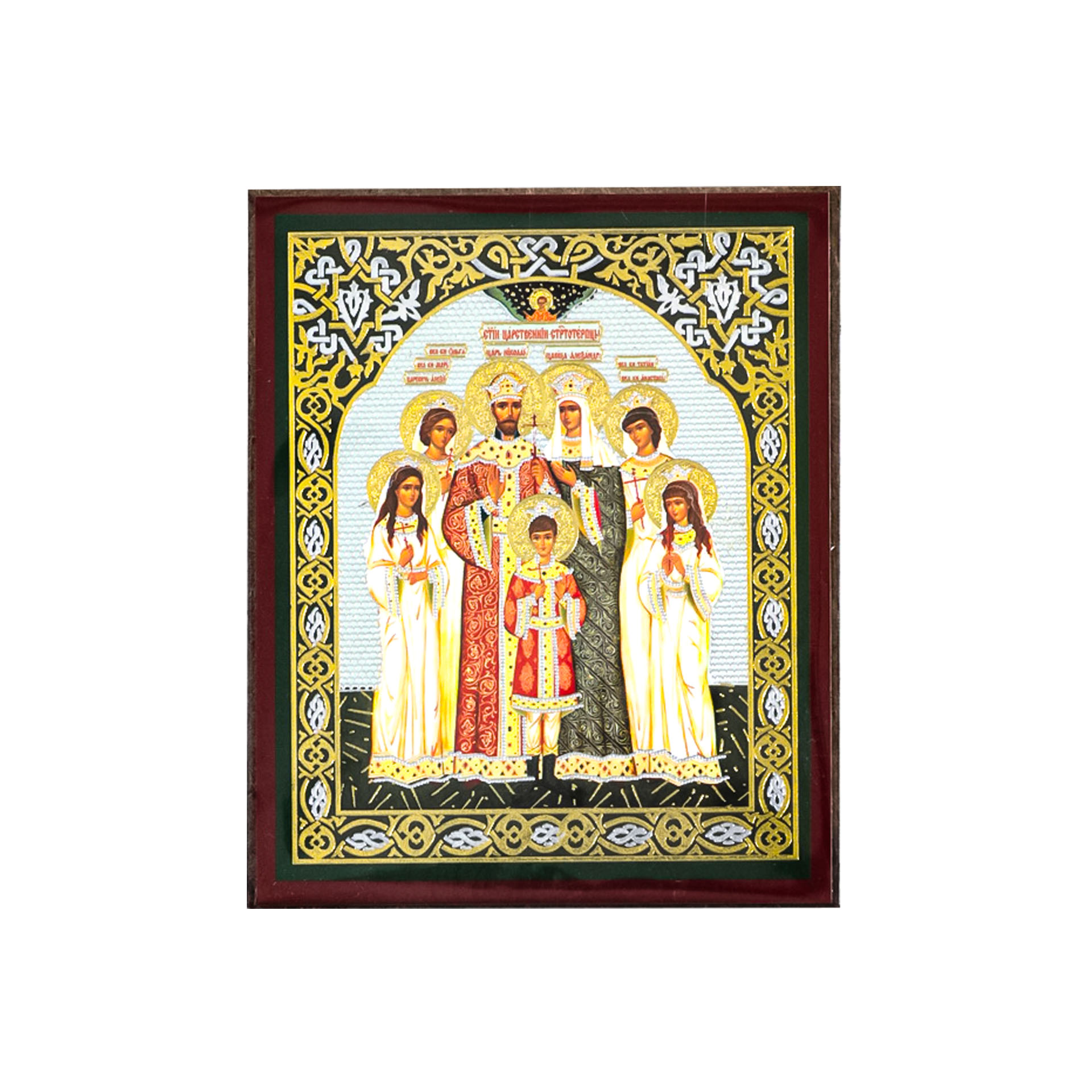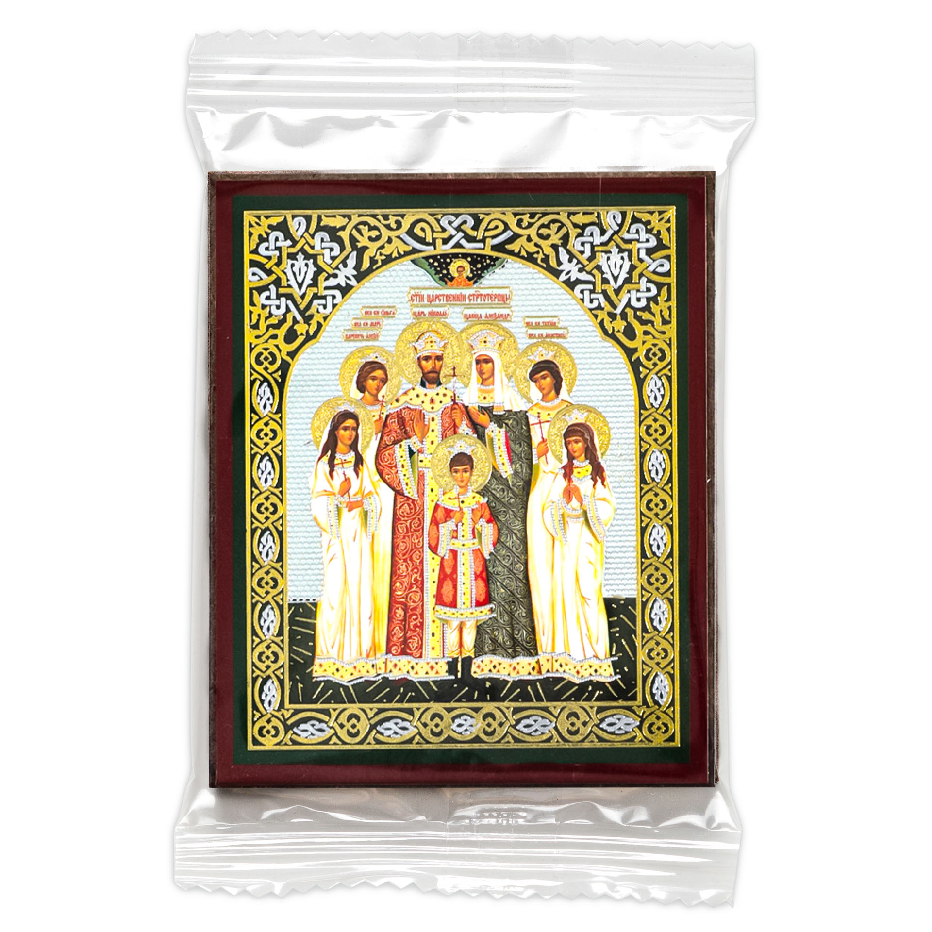 Икона на деревянном планшете 6х9 двойное тиснение, аннотация, упаковка Царская семья