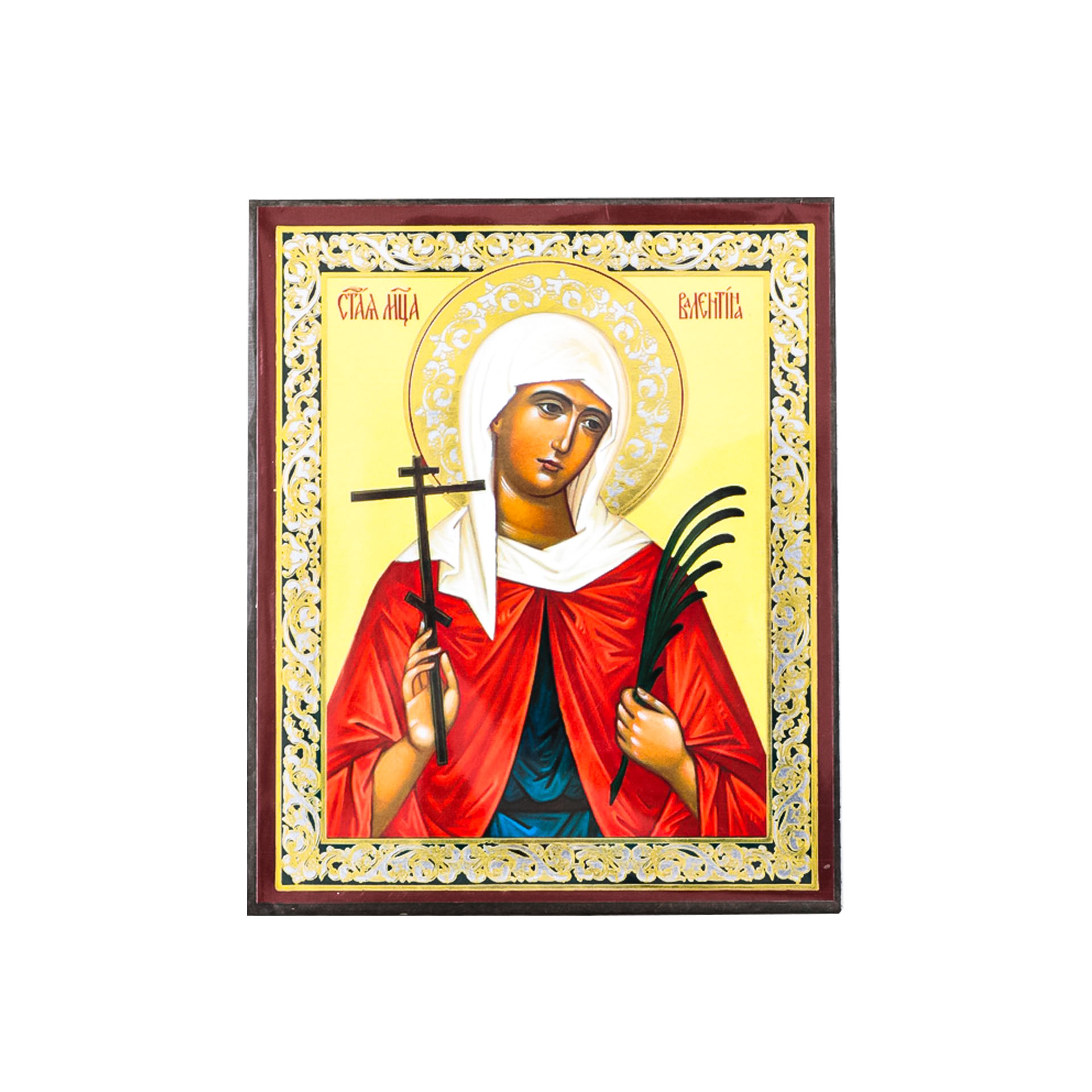 Икона на деревянном планшете 6х9 двойное тиснение, аннотация, упаковка Валентина Кесарийская, дева, мц. (3)