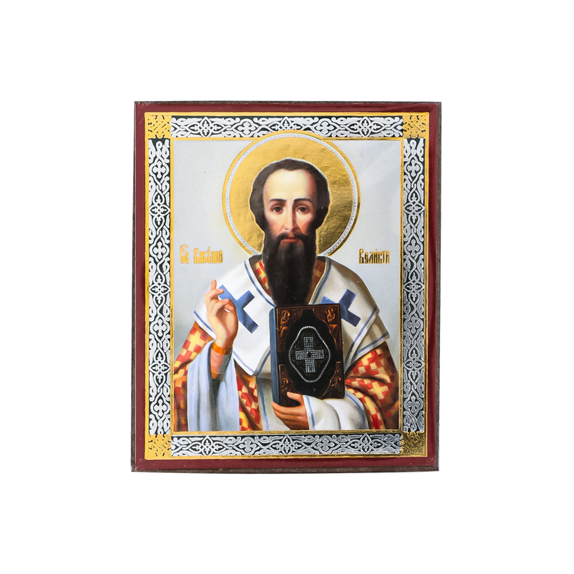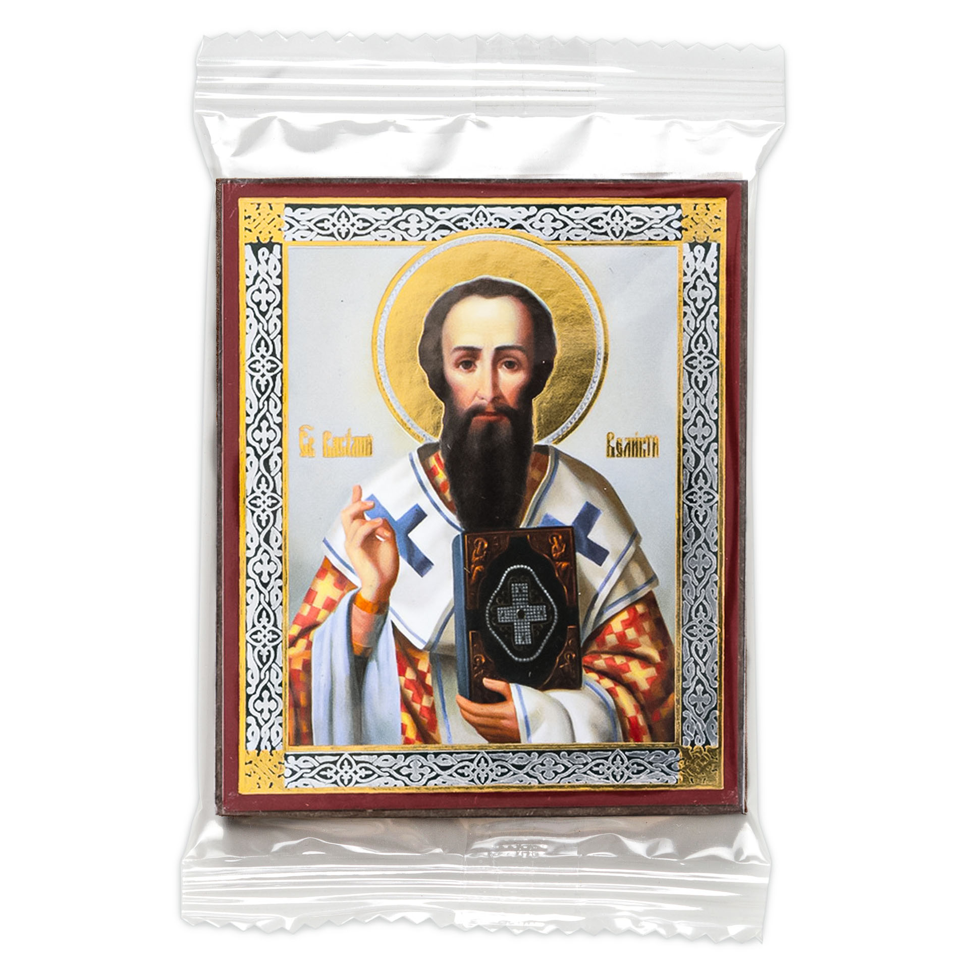 Икона на деревянном планшете 6х9 двойное тиснение, аннотация, упаковка Василий Великий