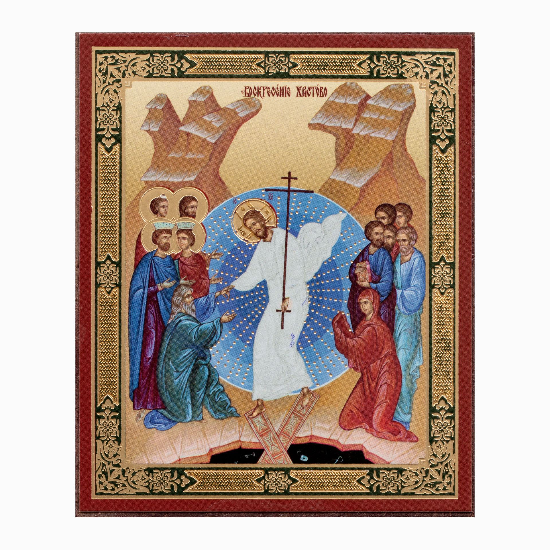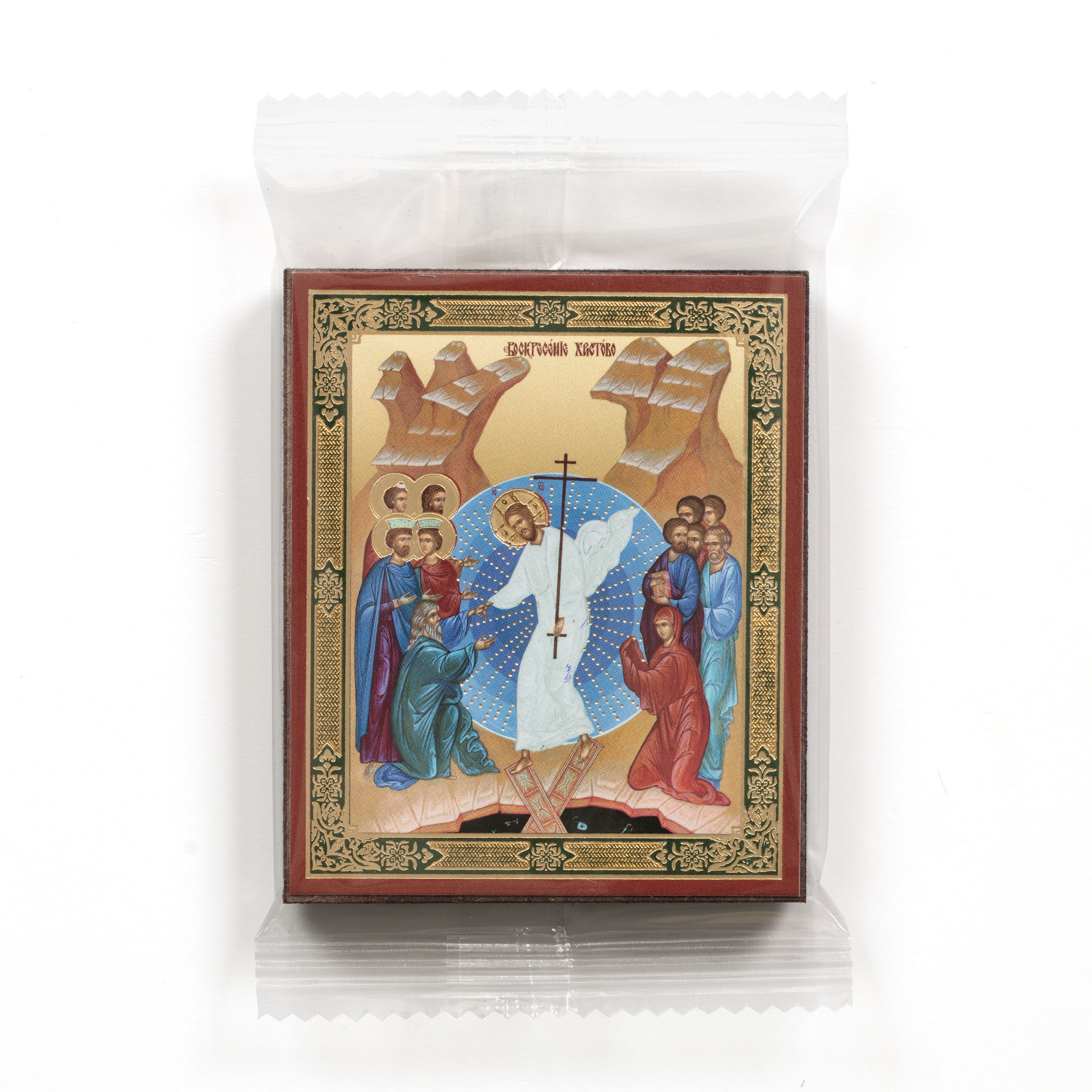 Икона на деревянном планшете 6х9 двойное тиснение, аннотация, упаковка Воскресение Христово 70