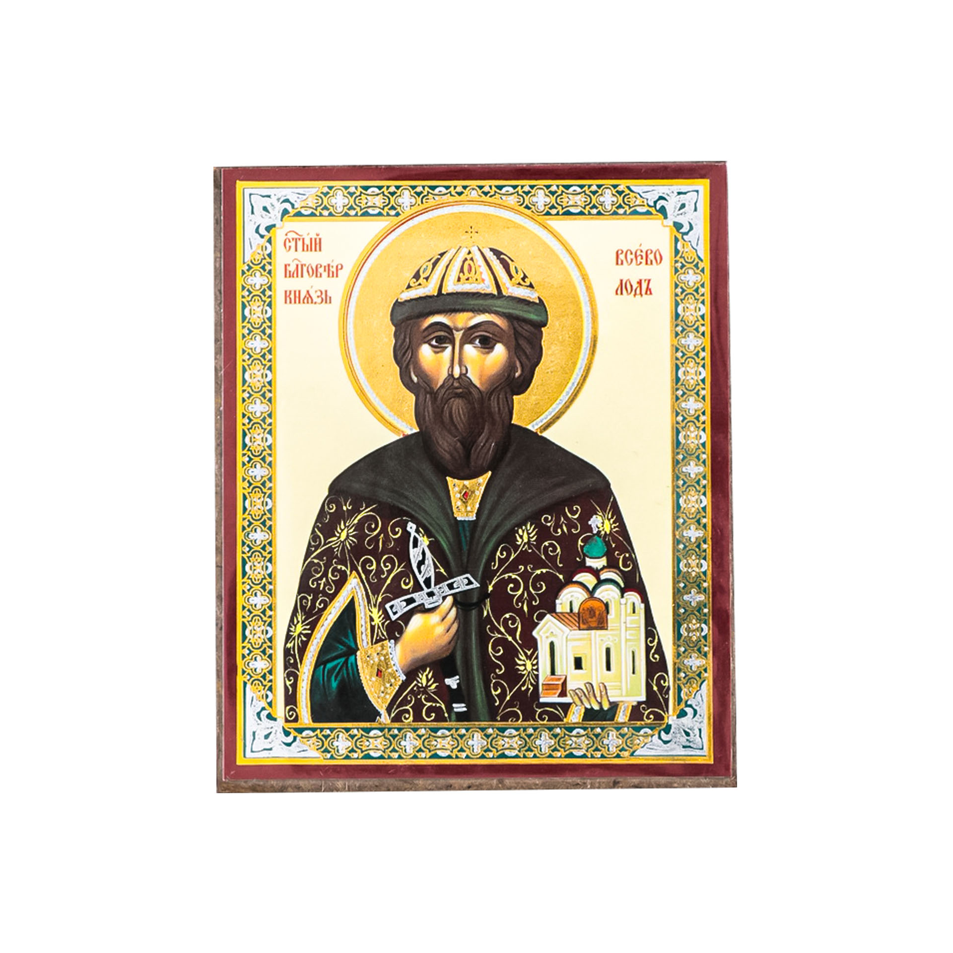 Икона на деревянном планшете 6х9 двойное тиснение, аннотация, упаковка Всеволод