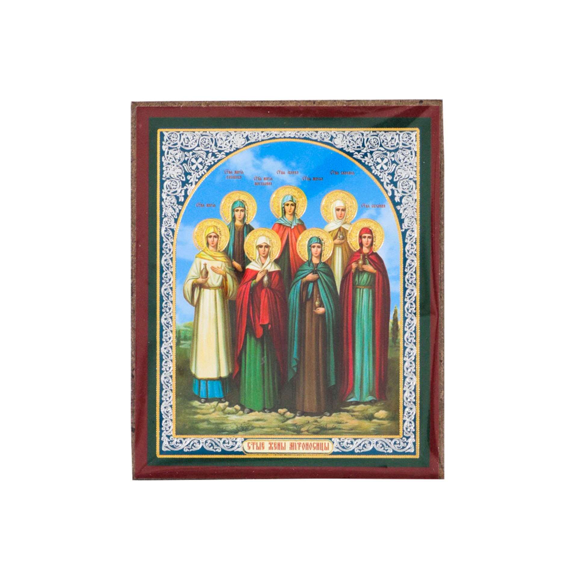 Икона на деревянном планшете 6х9 двойное тиснение, аннотация, упаковка Жены Мироносицы