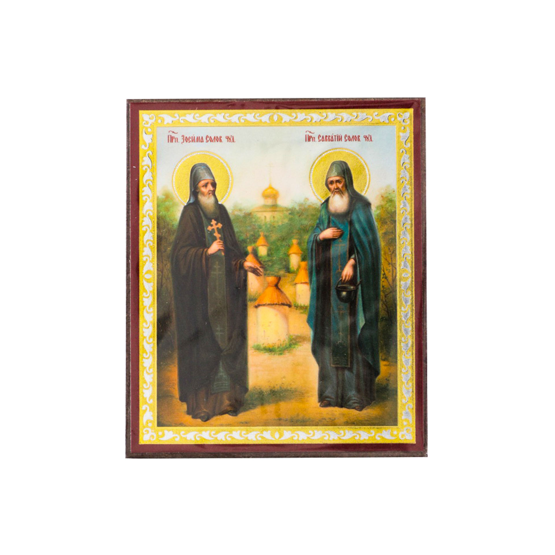 Икона на деревянном планшете 6х9 двойное тиснение, аннотация, упаковка Зосима и Савватий 2