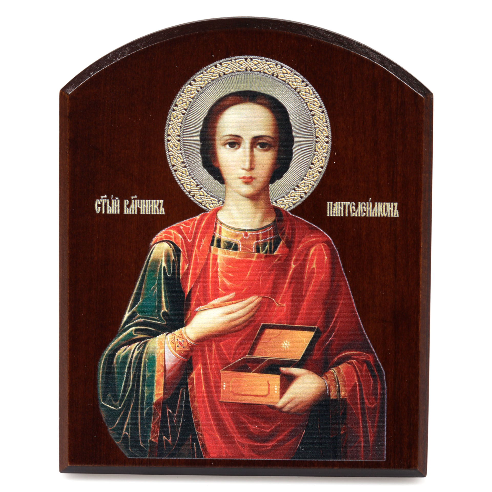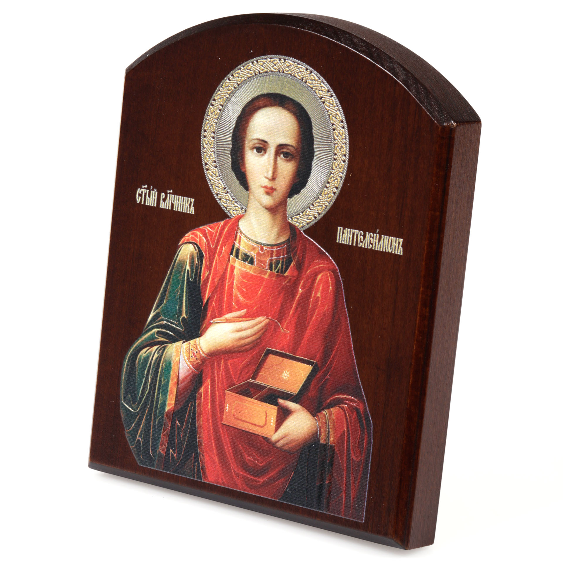 Икона на доске 10х12 объёмная печать, арочная, лак Пантелеимон 2