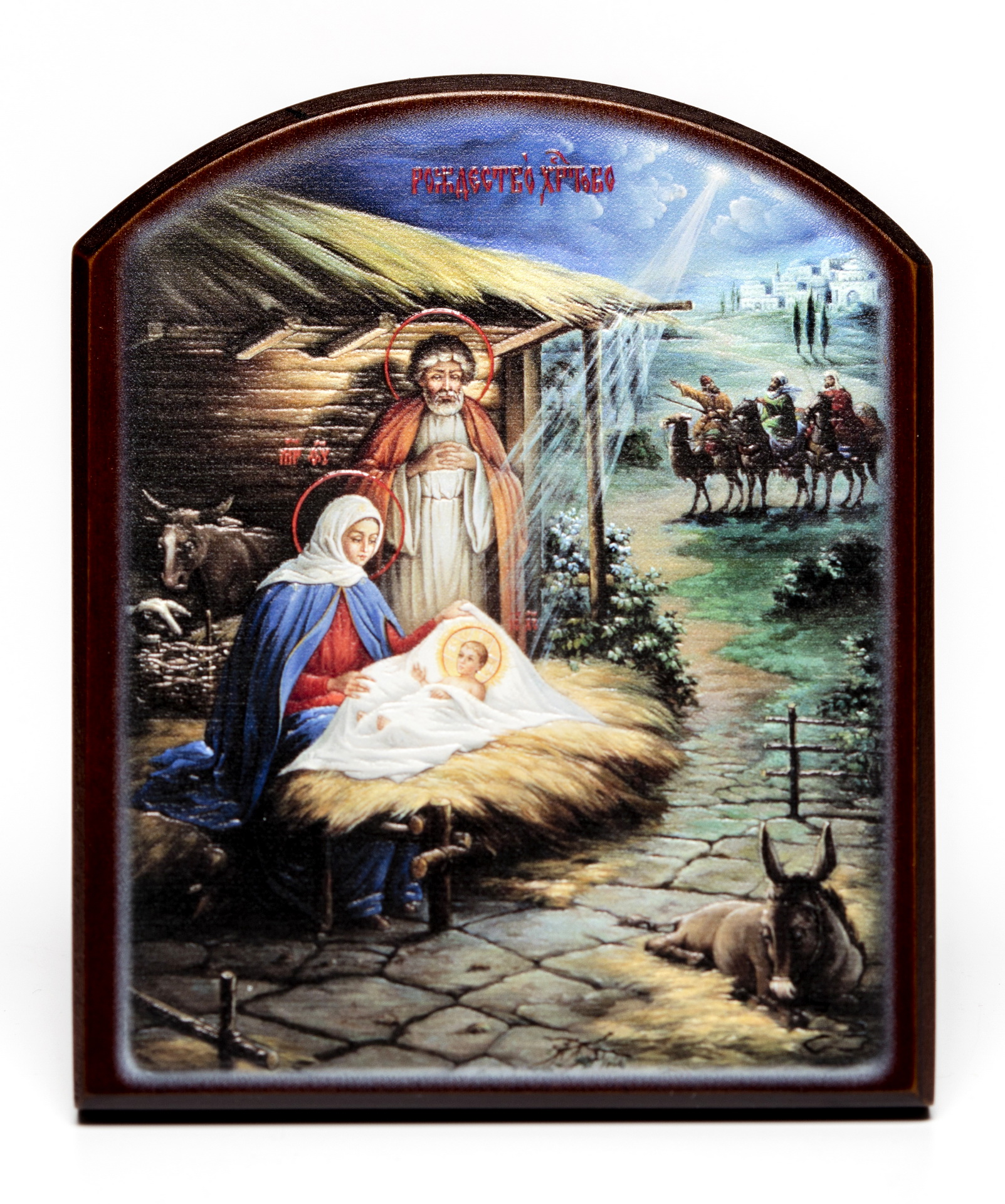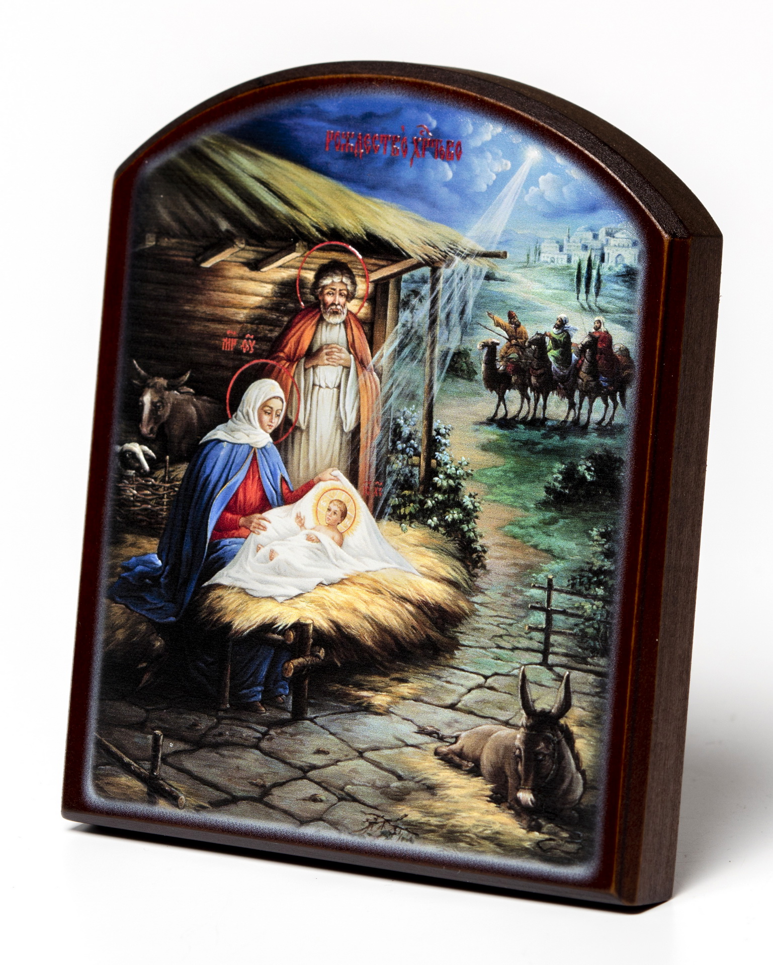 Икона на доске 10х12 объёмная печать, арочная, лак Рождество Христово 3