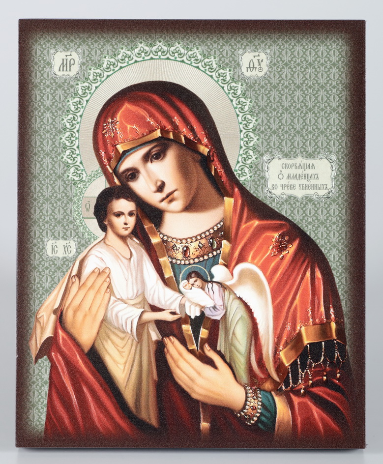 Икона на доске 13х15 объёмная печать, лак Скорбящая Б.М. о младенцах во чреве убиенных