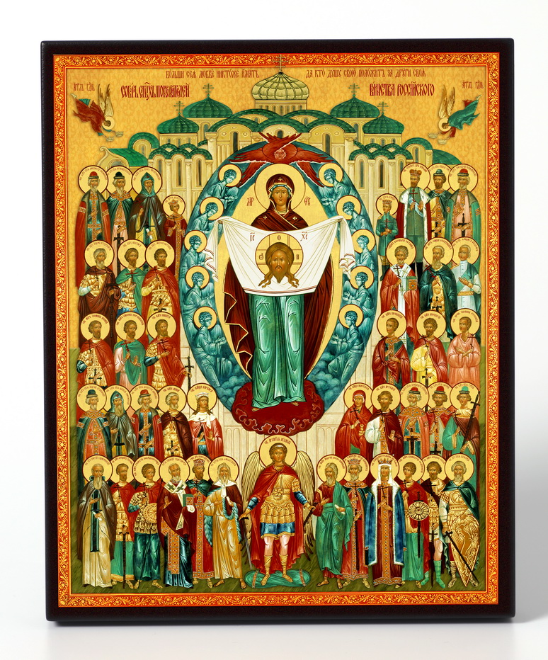 Это икона "Собор Святых Покровителей воинства российского". На ней собраны святые, особо почитаемые в наших войсках в различные эпохи русской истории. Некоторые из святых в своей земной жизни были воинами и совершили славные деяния служения на этой ниве, как, например, Александр Невский. В храмах их образы обращают на себя внимание тем, что зачастую там святой изображён с оружием и в воинских доспехах. Некоторые святые особо почитаются в определённых родах войск (на флоте - праведный Феодор Ушаков, святитель Николай Мирликийский, апостол Андрей, в пограничных войсках - преподобный Илия Муромец, в воздушно-десантных войсках - пророк Илия).