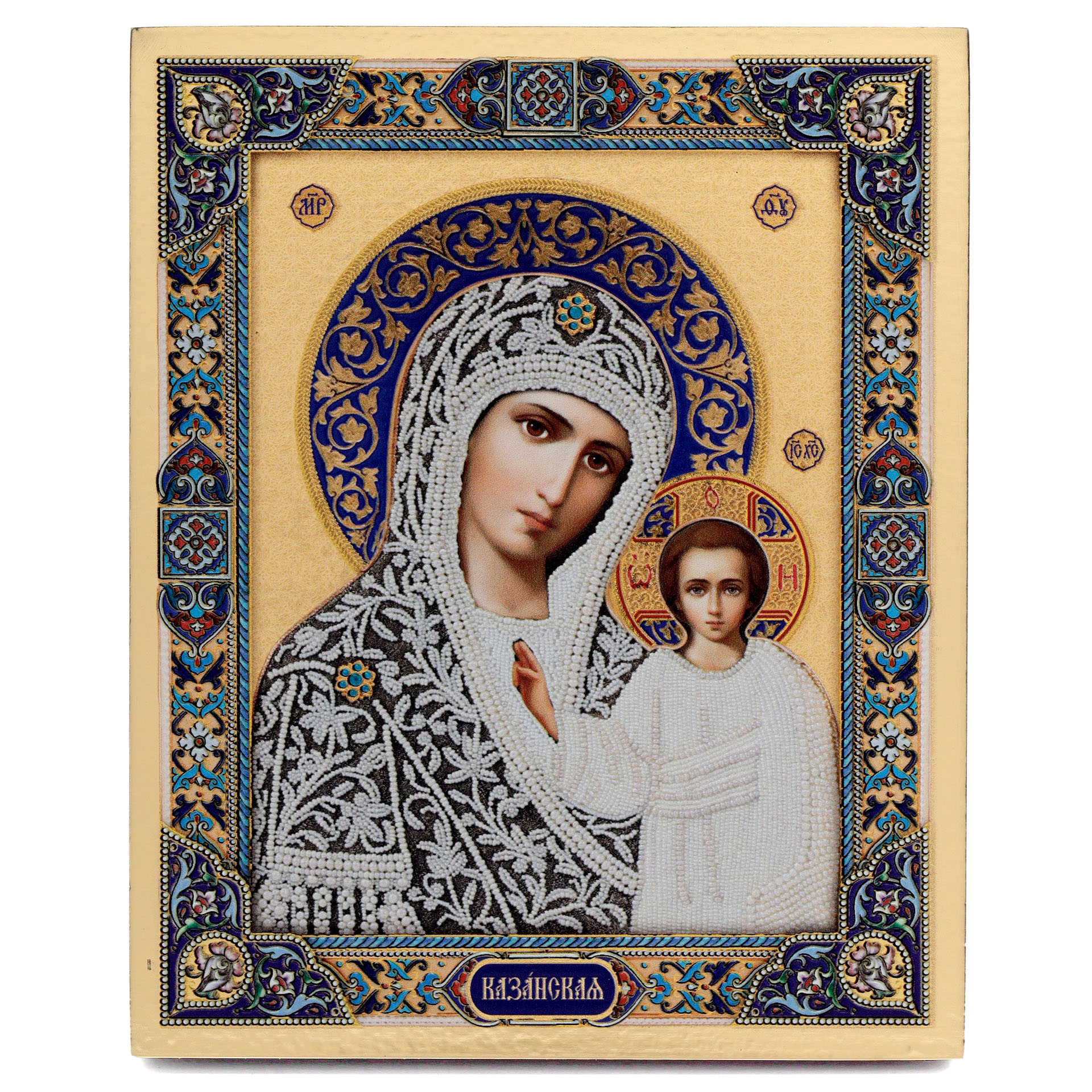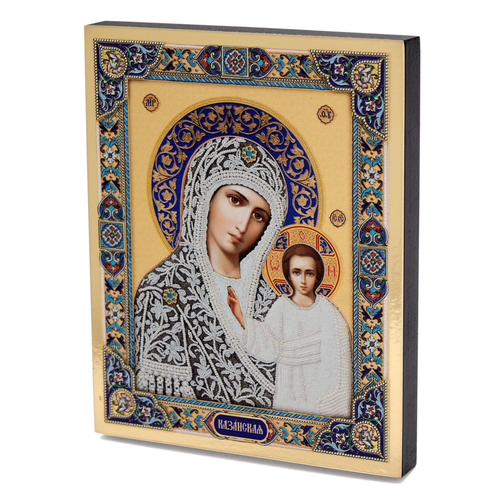 Икона на доске 13х15 золоченое покрытие, объёмная печать, лак Казанская БМ 5 (жемчуг)