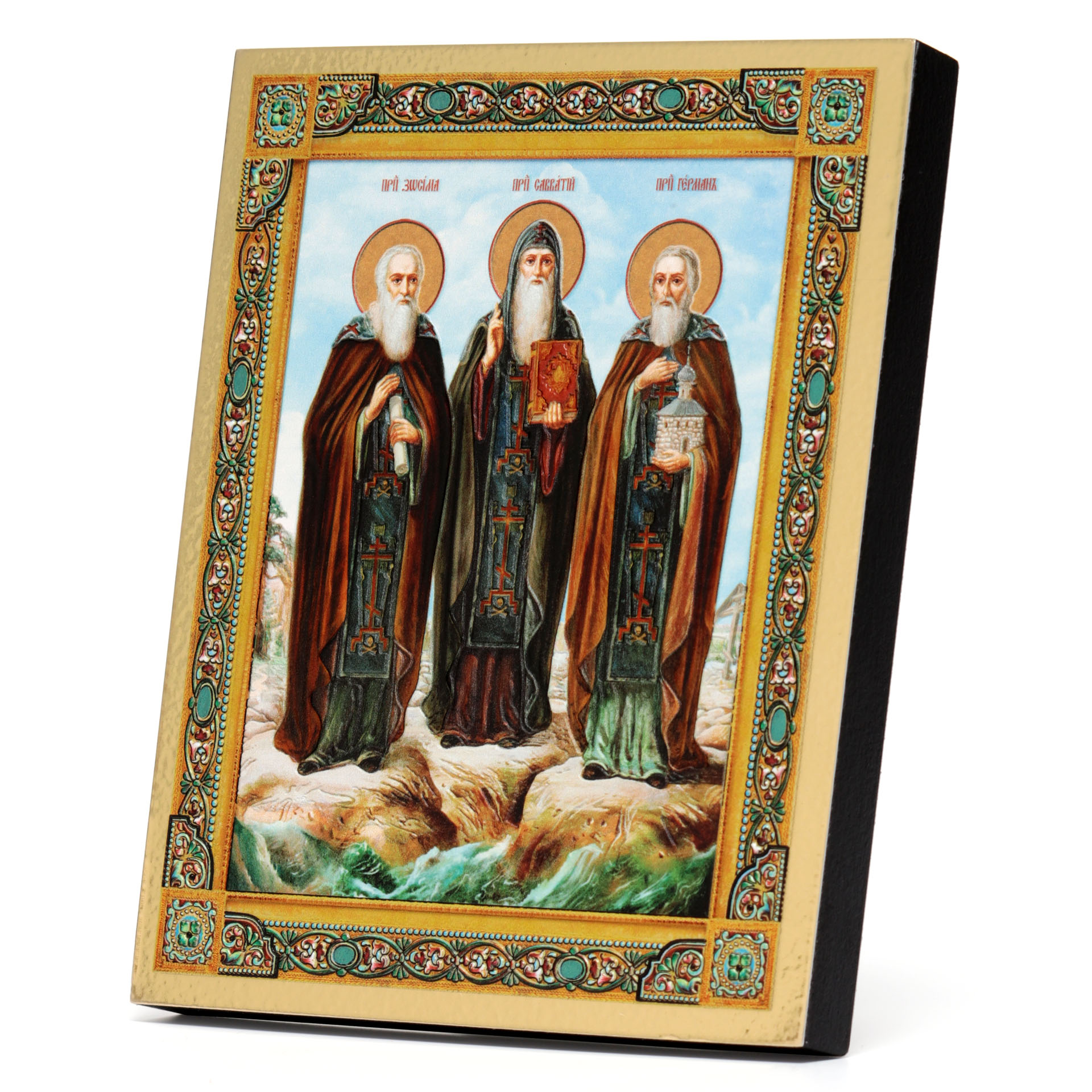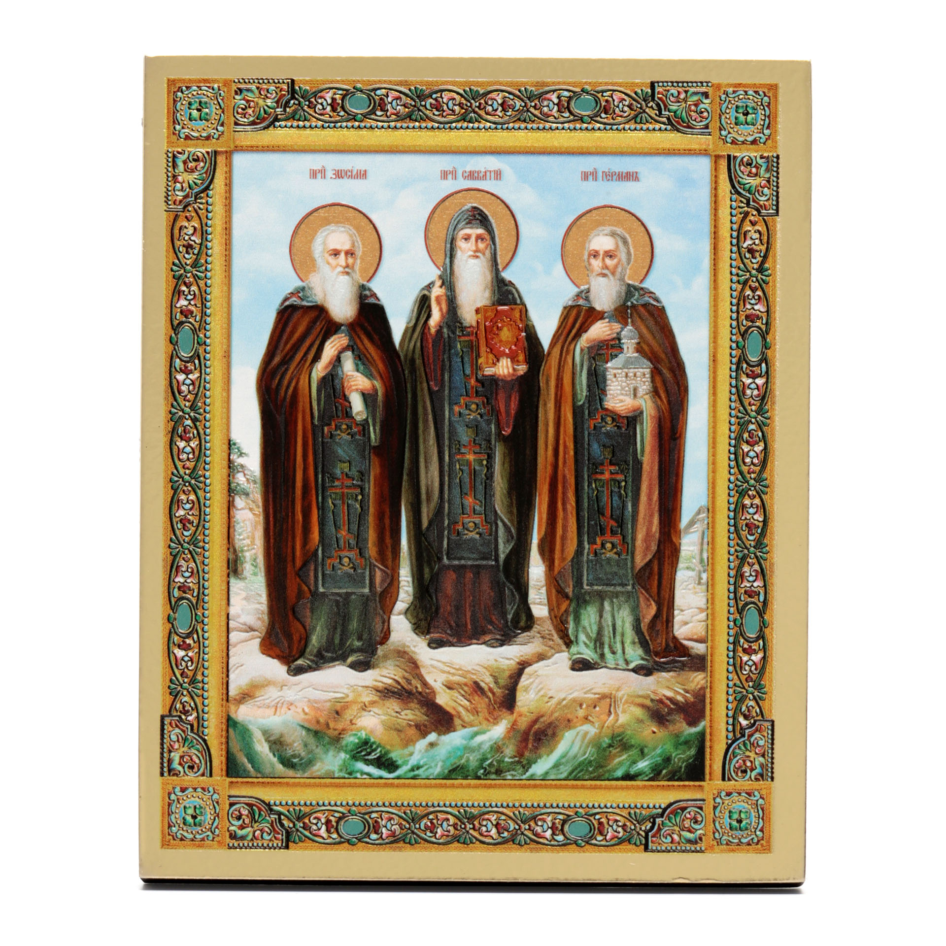 Икона на доске 13х15 золоченое покрытие, объёмная печать, лак Соловецкие Святые