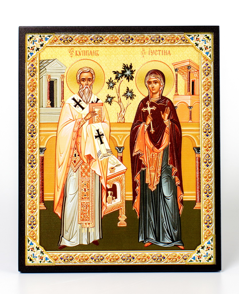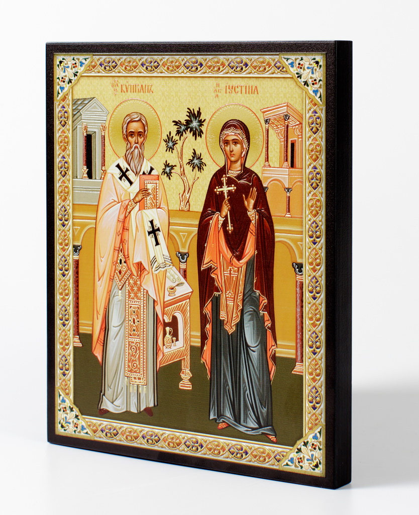Икона на доске 18х24 объёмная печать, лак Киприан и Иустина,