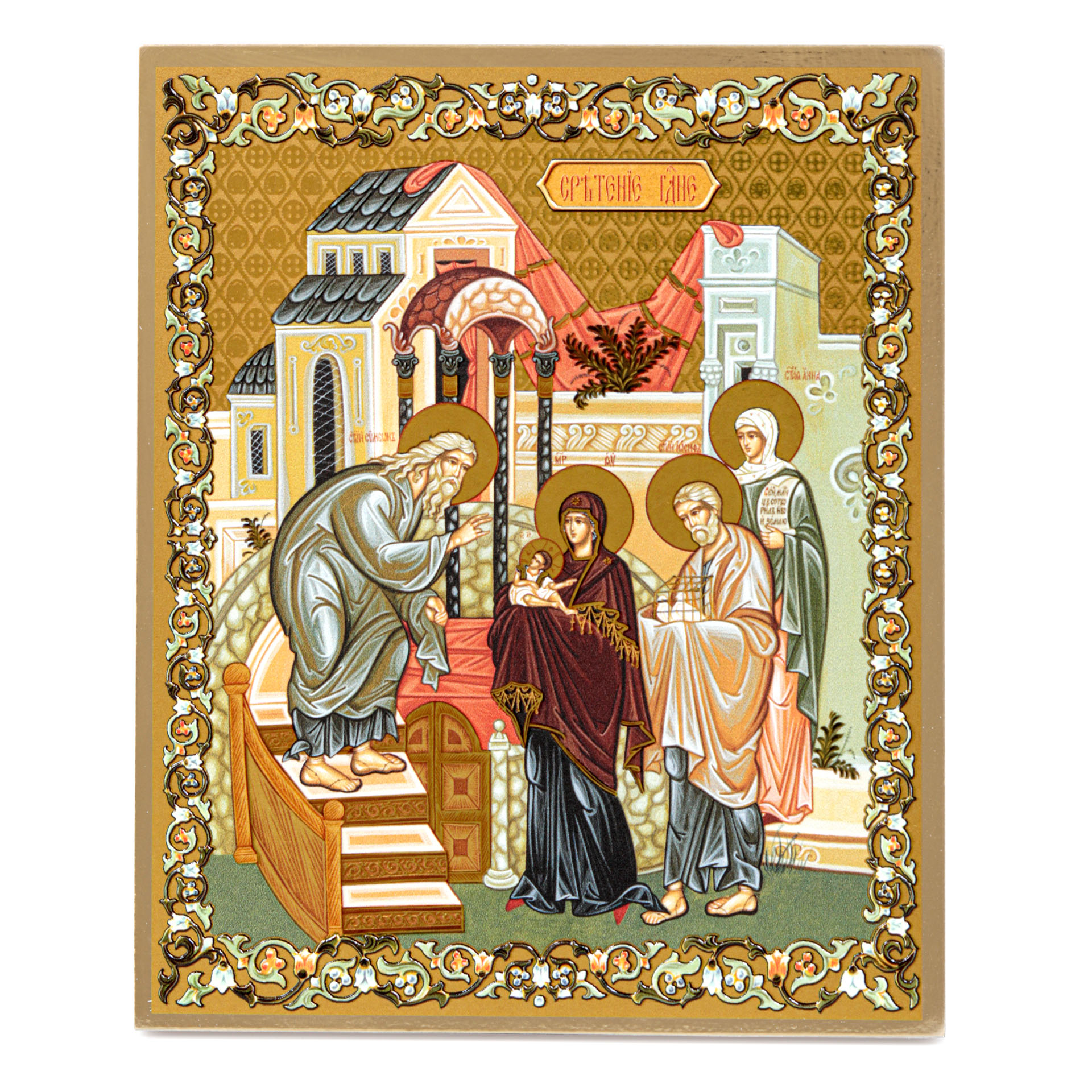 Икона на доске 18х24 золоченое покрытие, объёмная печать, лак Сретение Господне