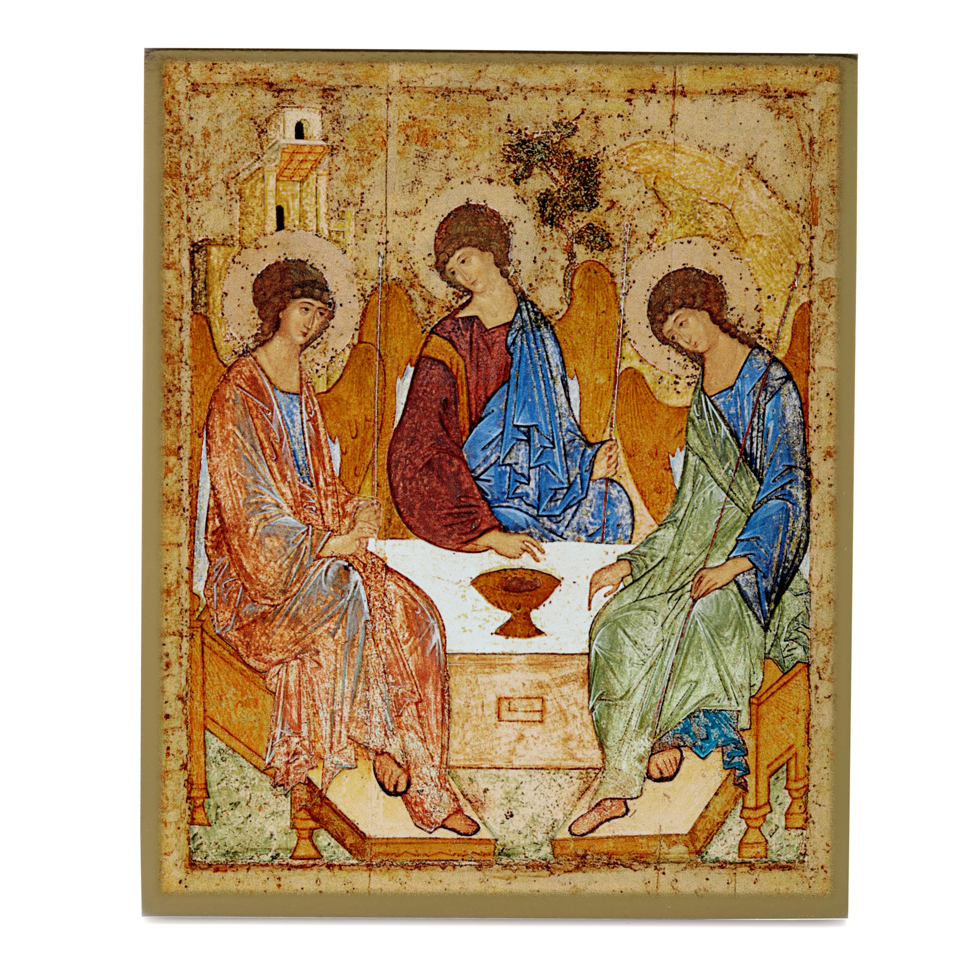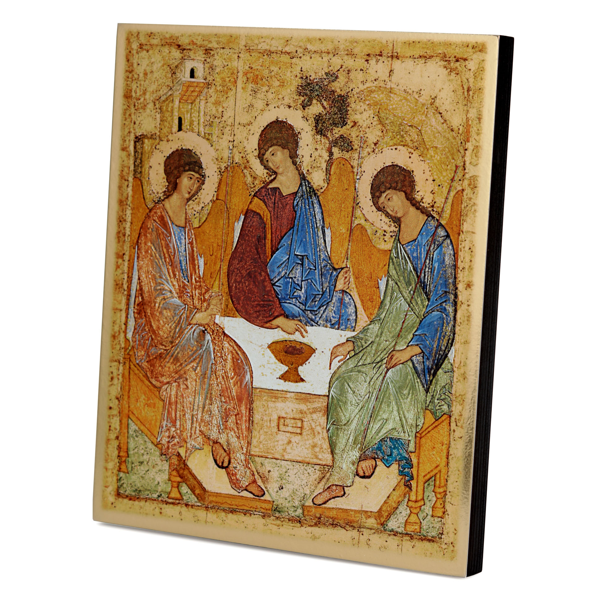 Икона на доске 18х24 золоченое покрытие, объёмная печать, лак Троица (Рублевская)