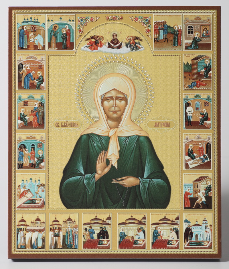 Икона на доске 22х26 объёмная печать, лак Матрона с житием