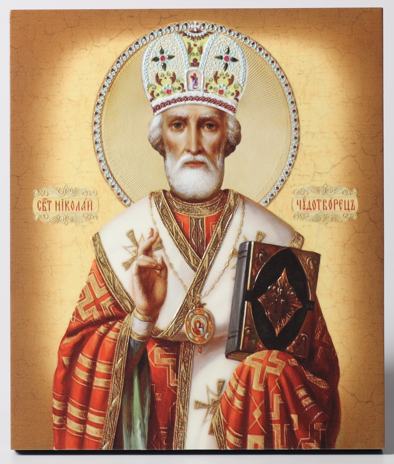 Икона на доске 22х26 объёмная печать, лак Николай Чудотворец поясной
