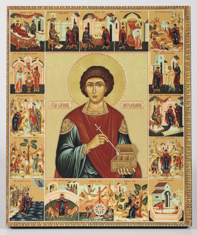 Икона на доске 22х26 объёмная печать, лак Пантелеимон с житием