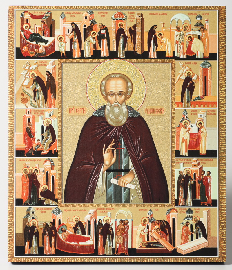 Икона на доске 22х26 объёмная печать, лак Сергий Радонежский с житием