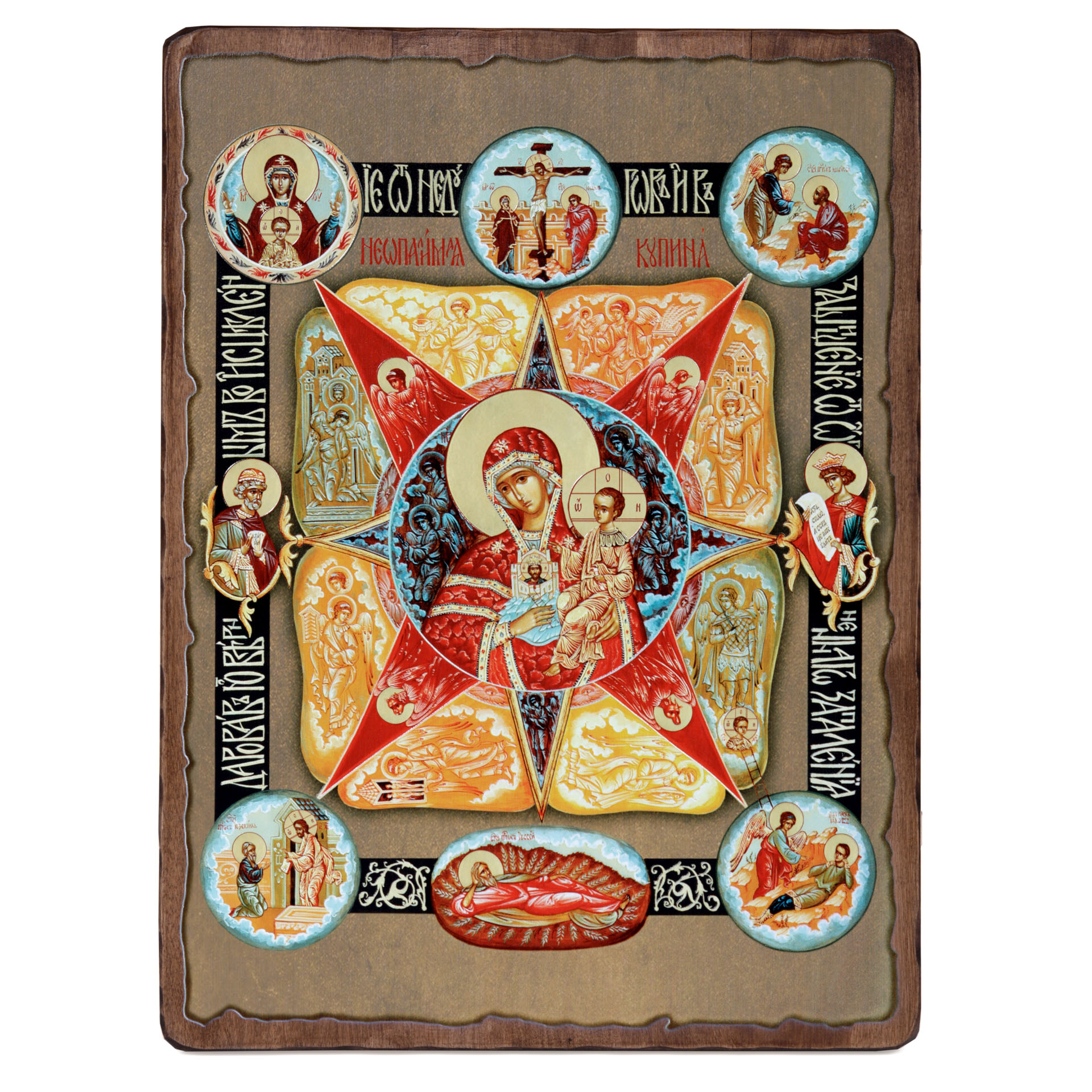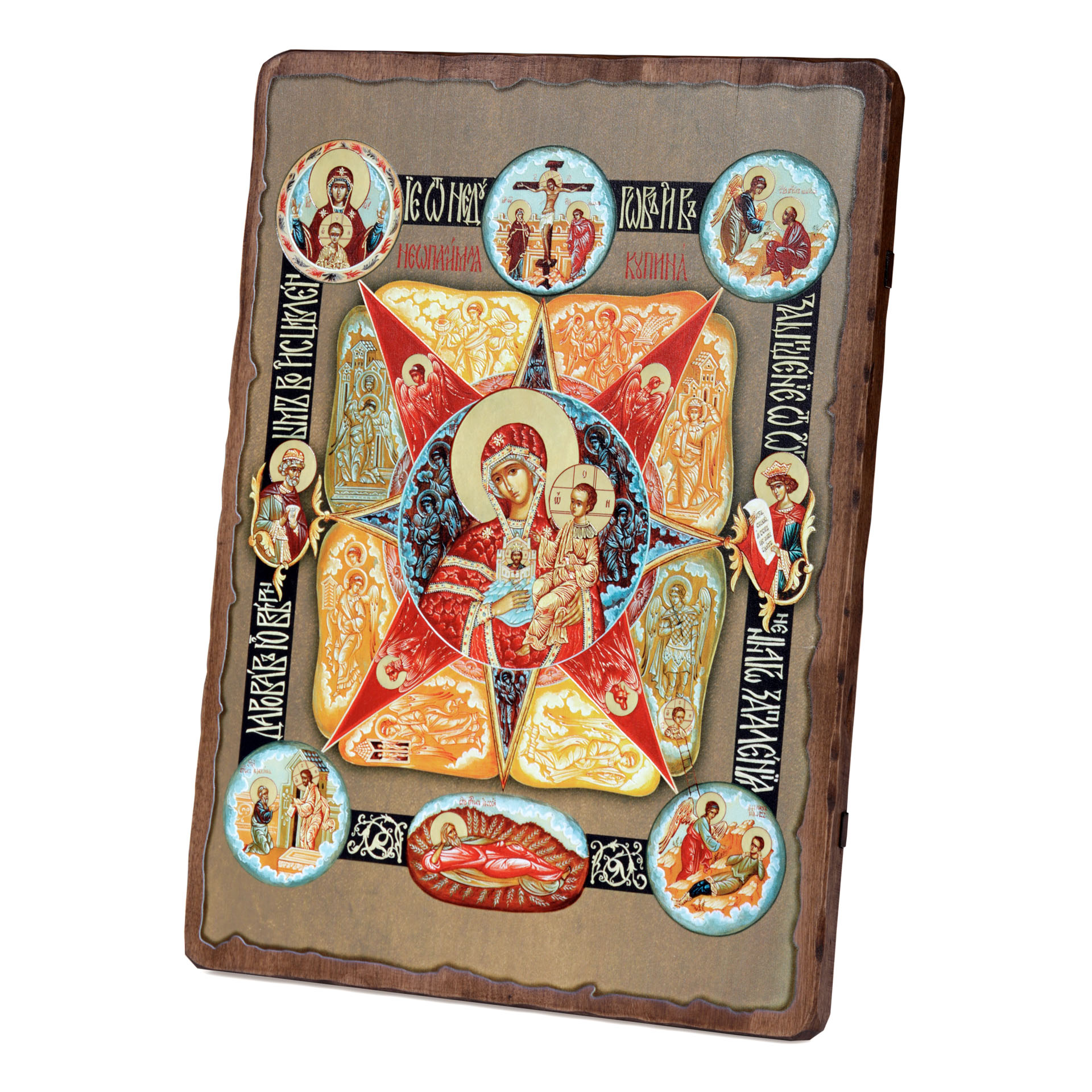Иконы изготовлены на досках «под старинное дерево». Доски искусственно состарены и могут иметь трещины, сколы и потертости.