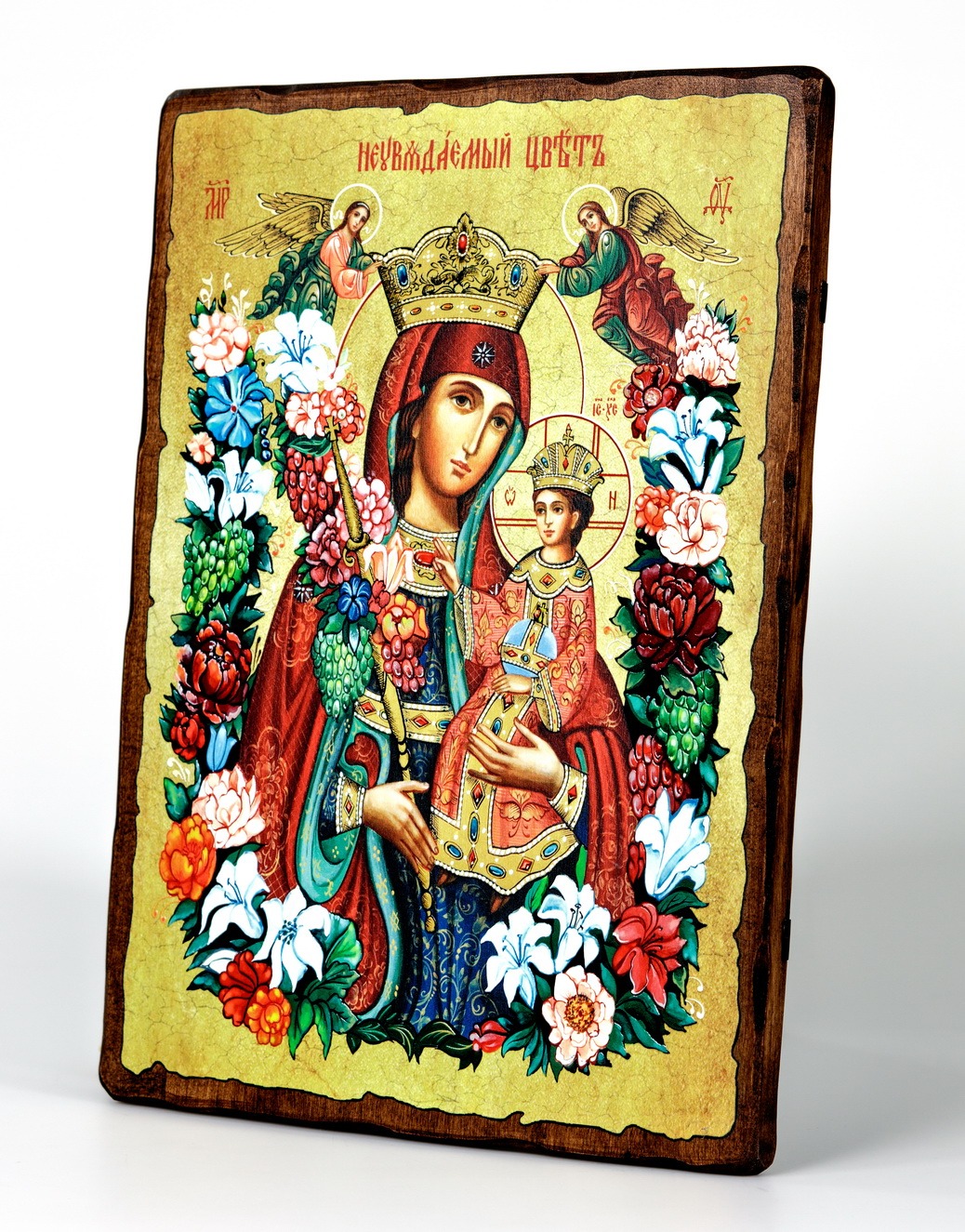 Иконы изготовлены на досках «под старинное дерево». Доски искусственно состарены и могут иметь трещины, сколы и потертости.