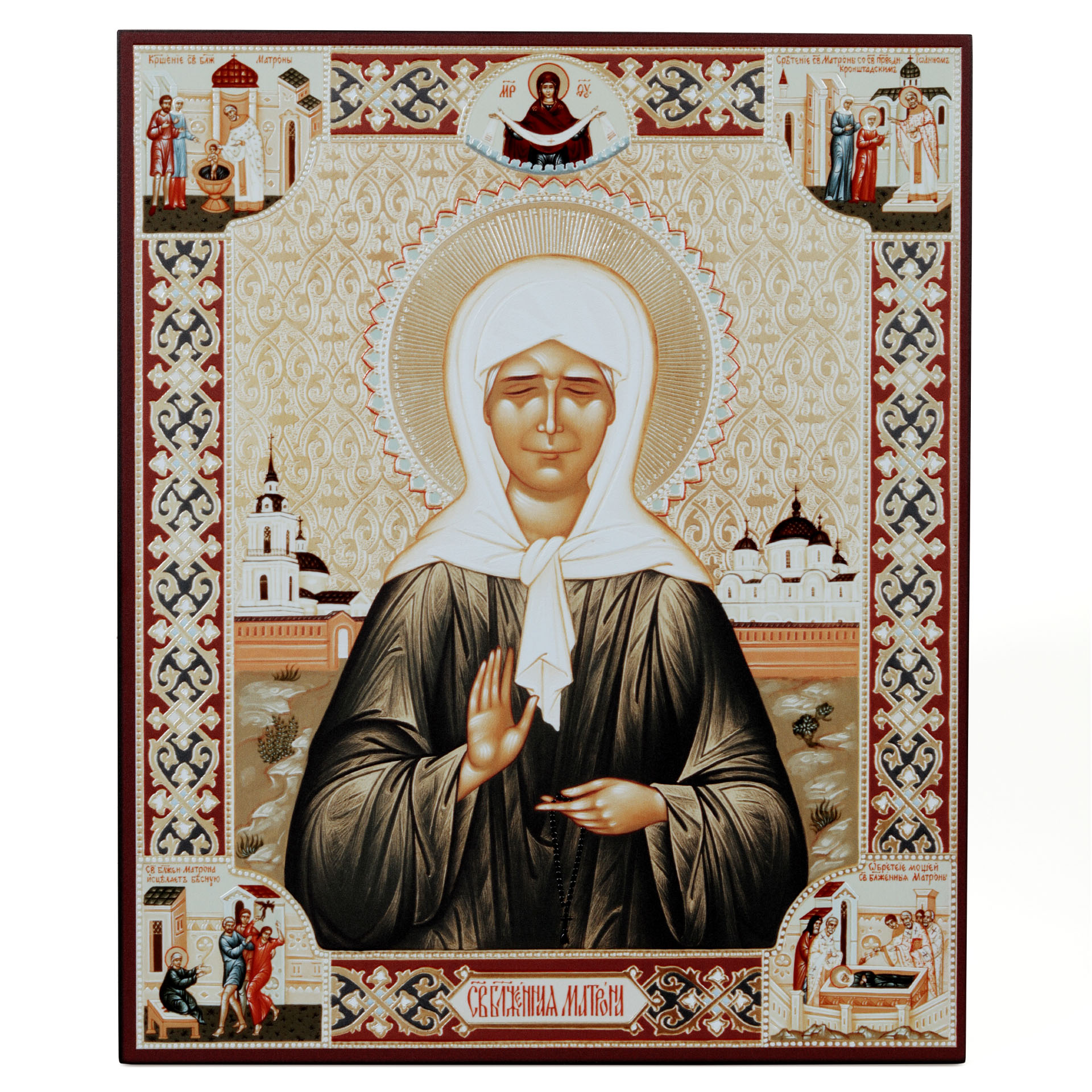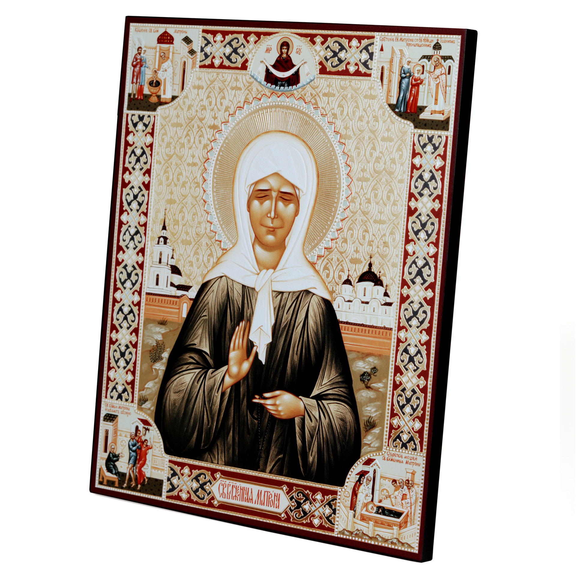 Икона на доске 33х40 объемная печать, лак Матрона с клеймами