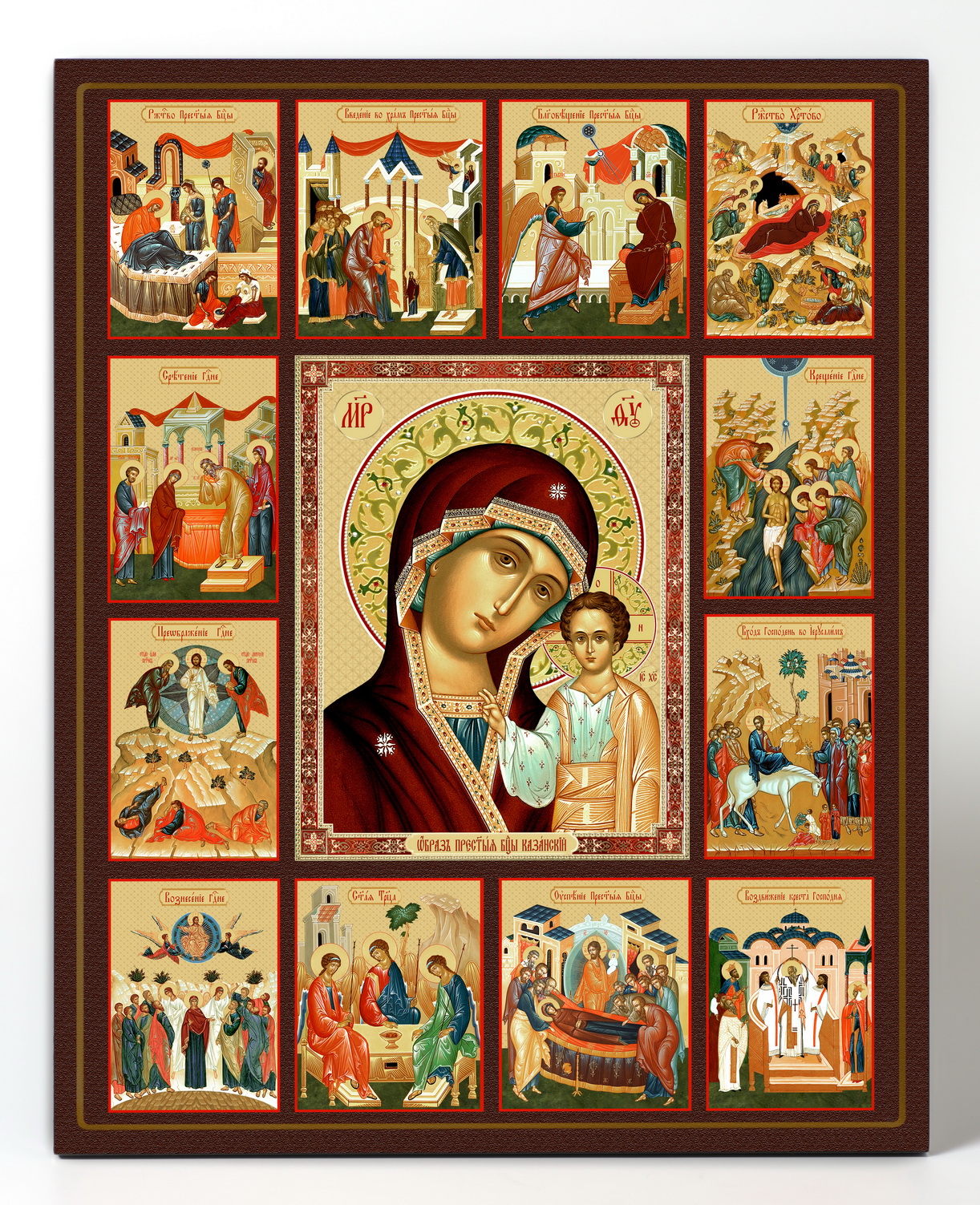 Икона на доске 40х50 объемная печать, лак Казанская с праздниками