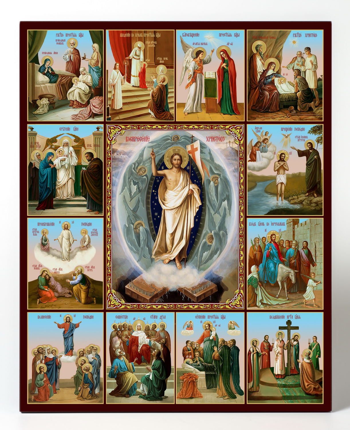 Икона на доске 40х50 объемная печать, лак Воскресение Христово с житием 2