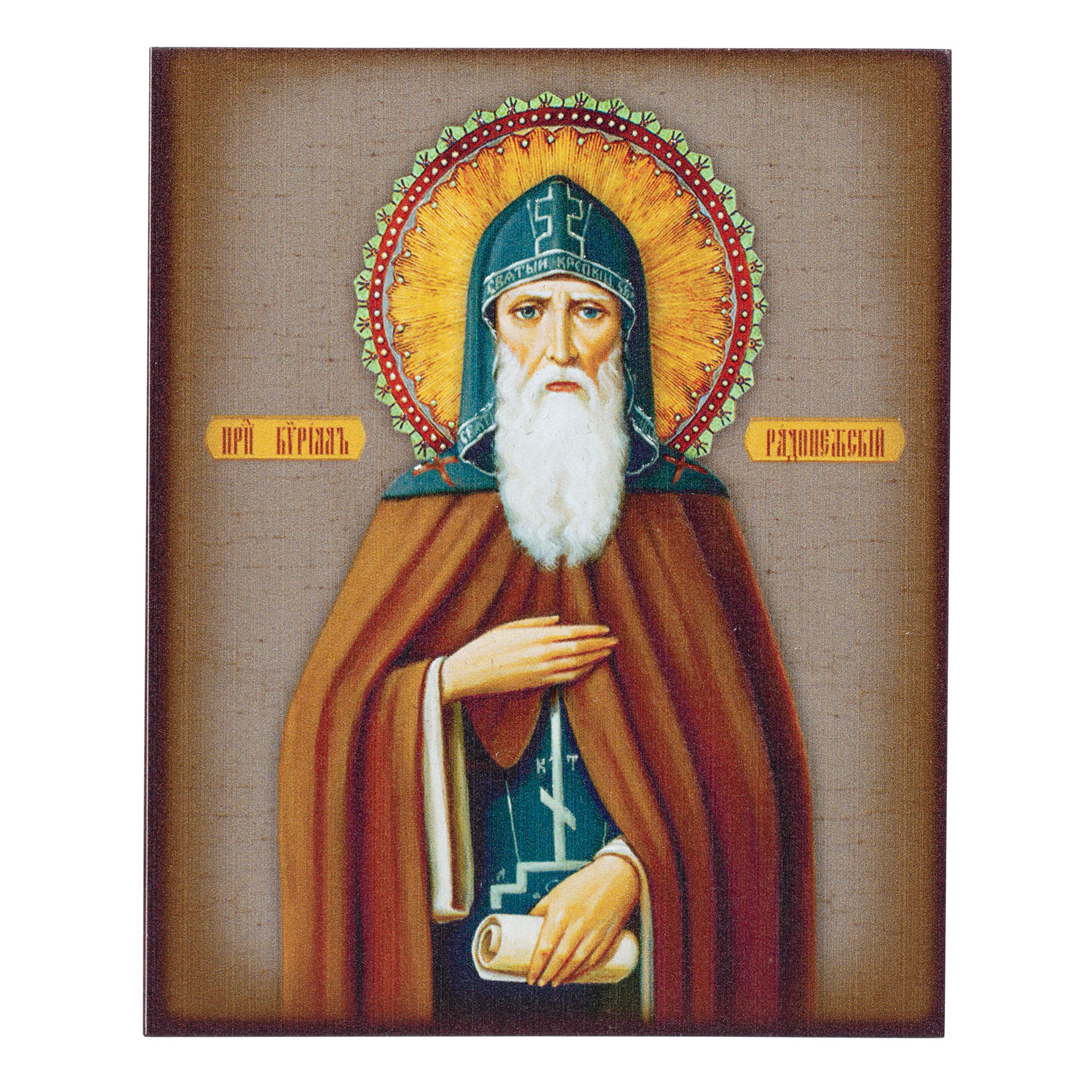 Икона на доске 9х11 объемная печать, лак Кирилл Радонежский