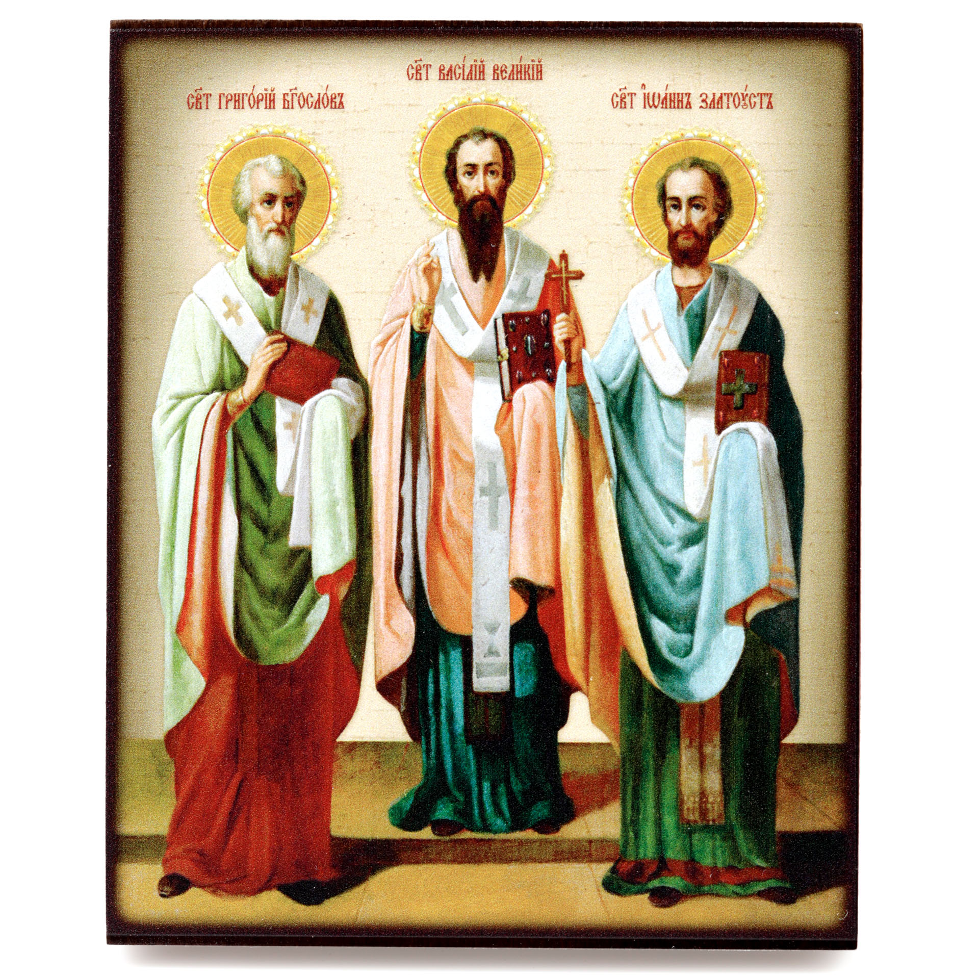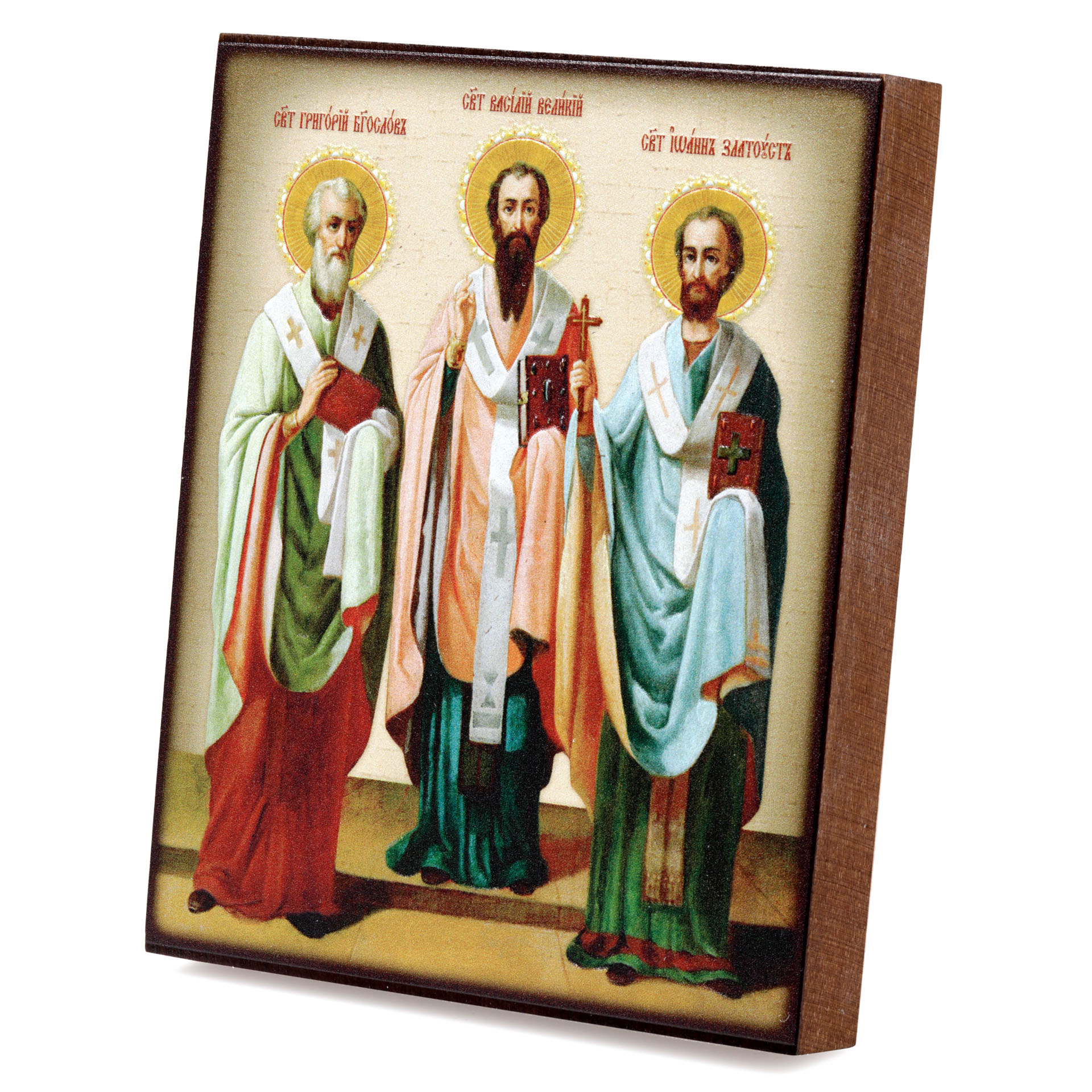 Икона на доске 9х11 объемная печать, лак Три Святителя