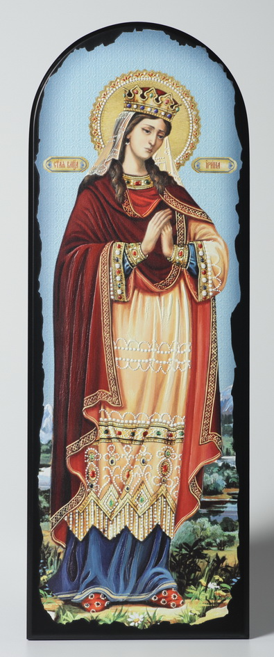 Икона на МДФ 18х50 арочная, объёмная печать, лак Ирина (рост.)